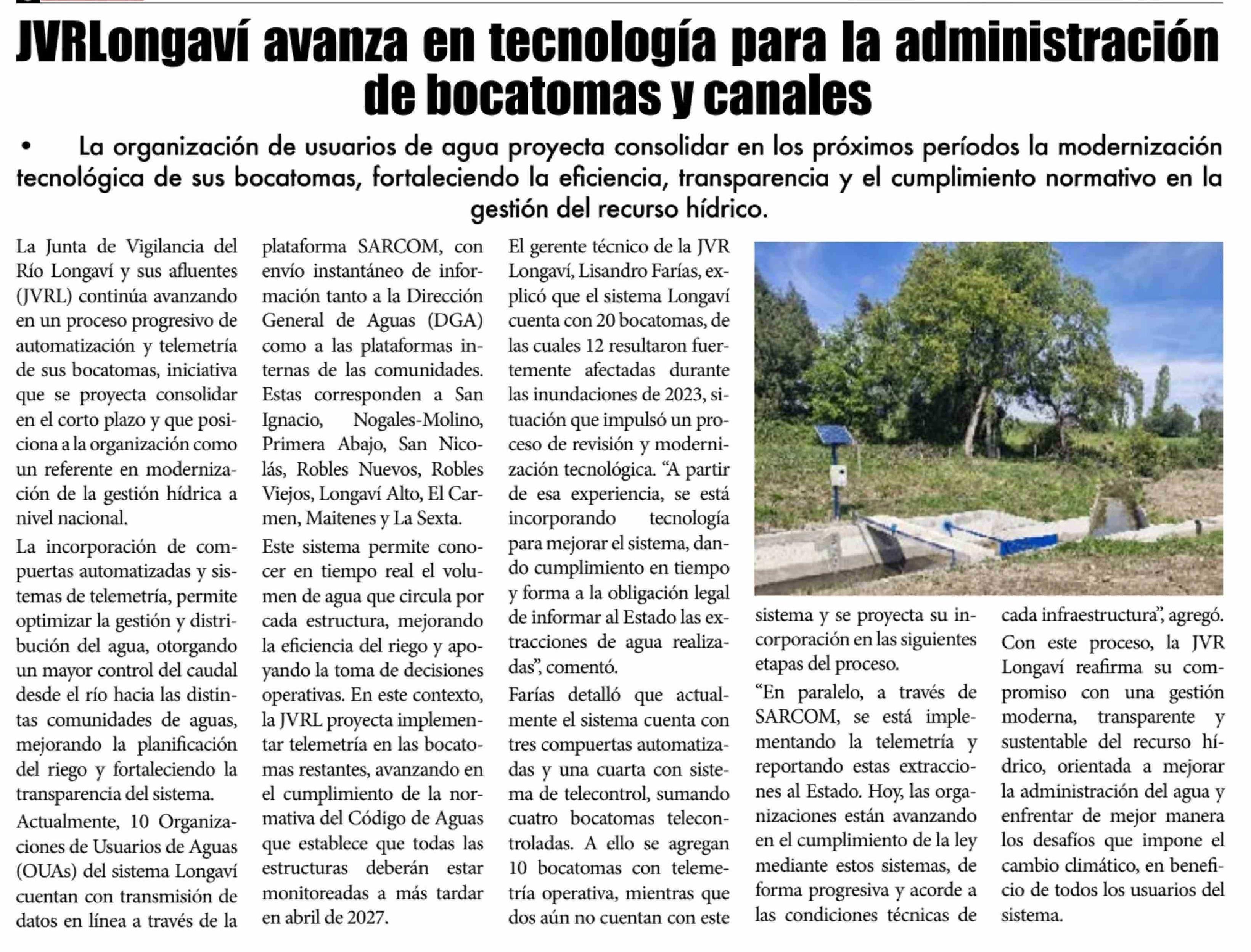 Título: JVRLongaví avanza en tecnología para la administración de bocatomas y canales