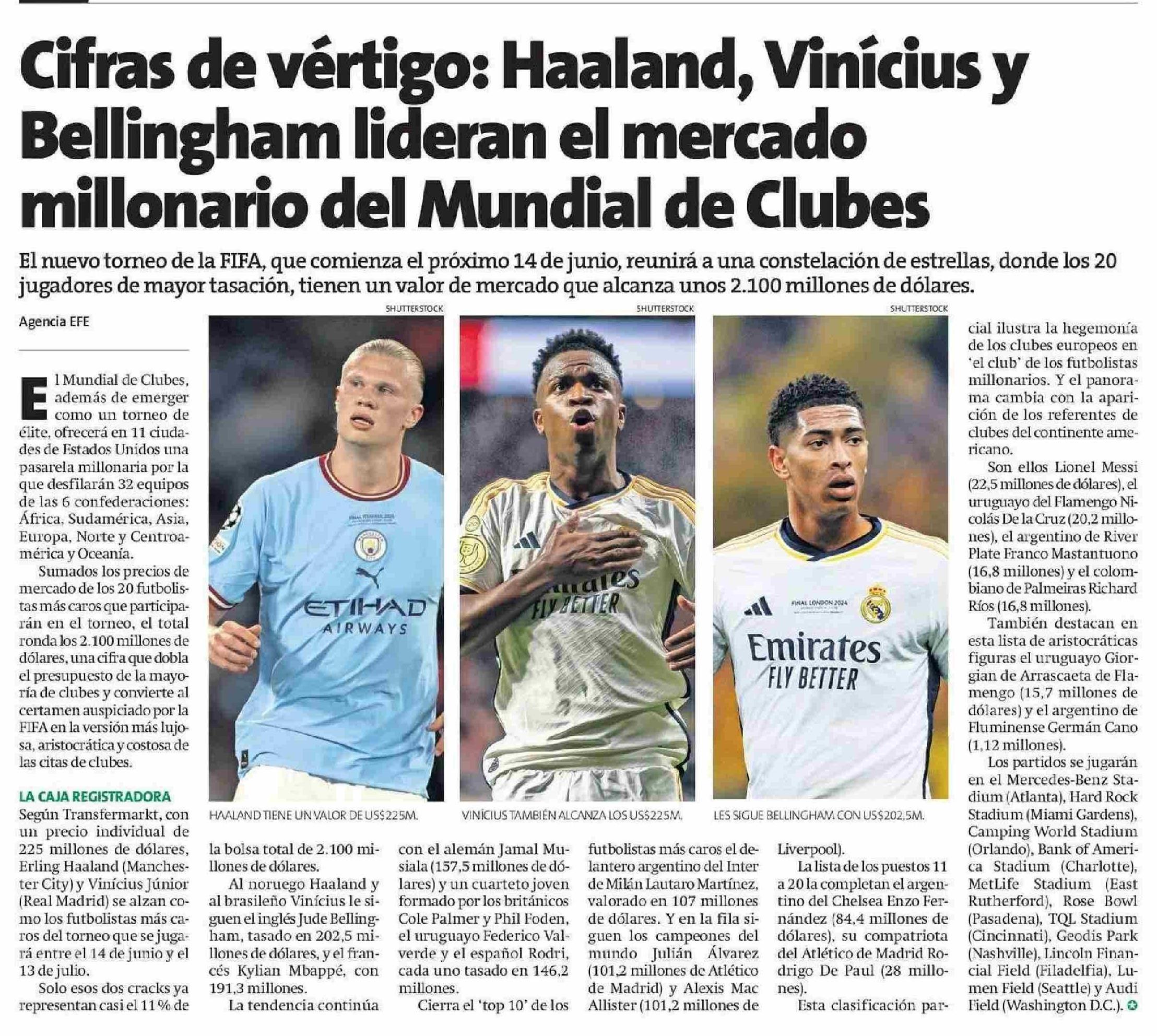 | Título: | Cifras de vértigo: Haaland, Vinicius y millonario del Mundial de Clubes Bellingham lideran el mercado |