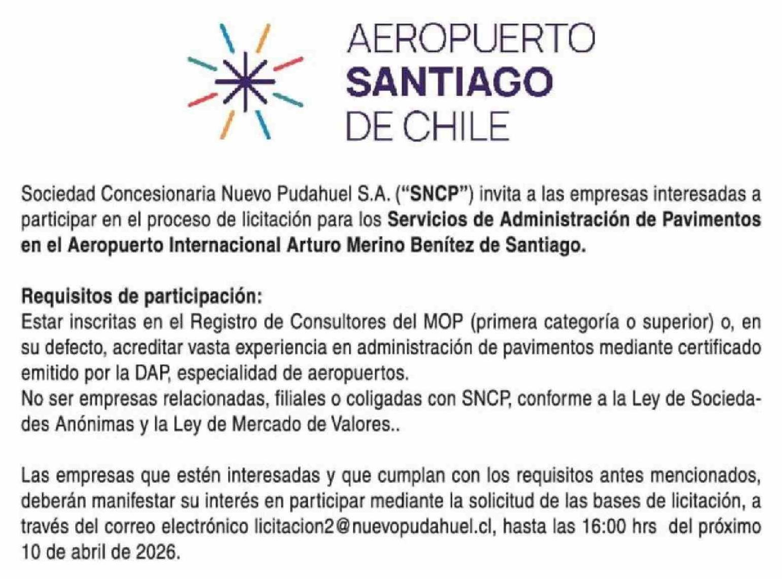 Aviso Licitaciones: AEROPUERTO SANTIAGO DE CHILE 27-03-2026 La Tercera |