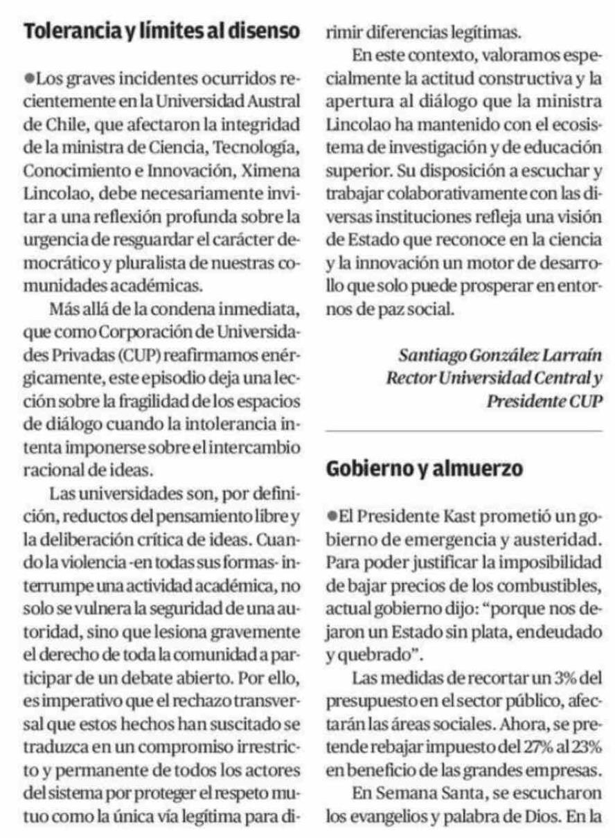 CARTAS: Tolerancia y límites al disenso 19-04-2026 El Mercurio de Antofagasta |