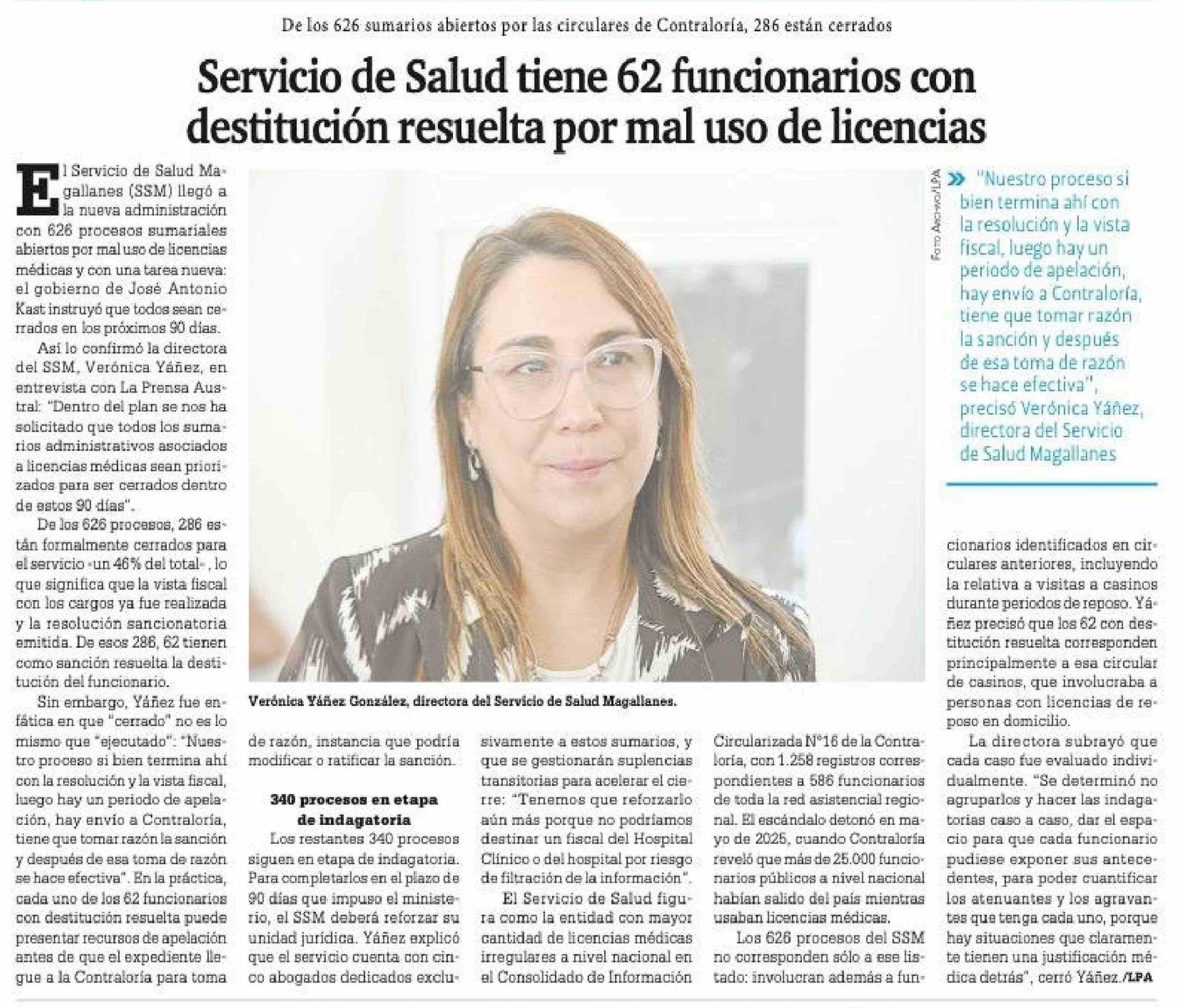 Servicio de Salud tiene 62 funcionarios con destitución resuelta por mal uso de licencias 21-03-2026 La Prensa Austral |