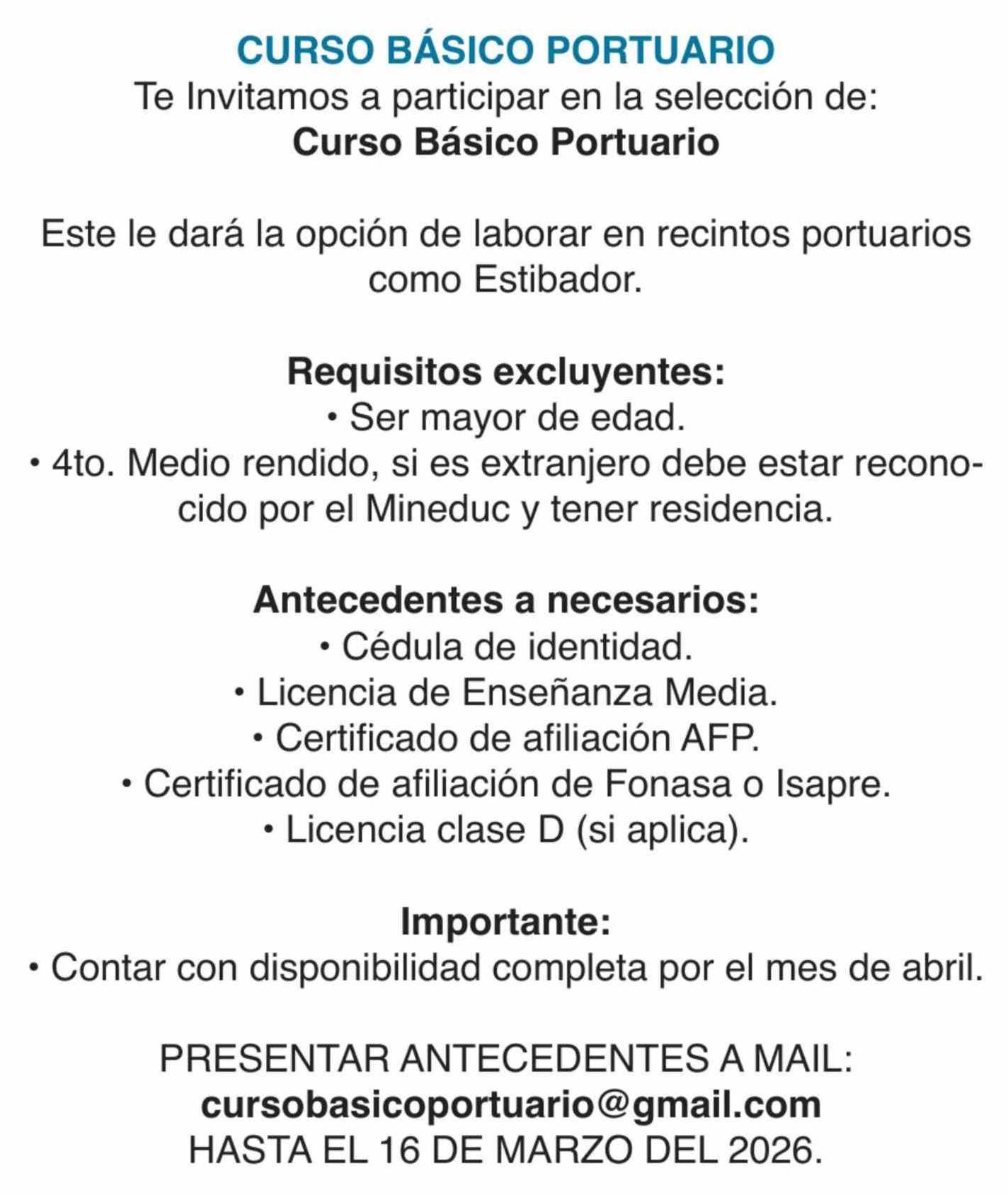 Aviso Publicitario: CURSO BÁSICO PORTUARIO Te Invitamos a participar en la selección de: Curso Básico Portuario 05-03-2026 El Pingüino |