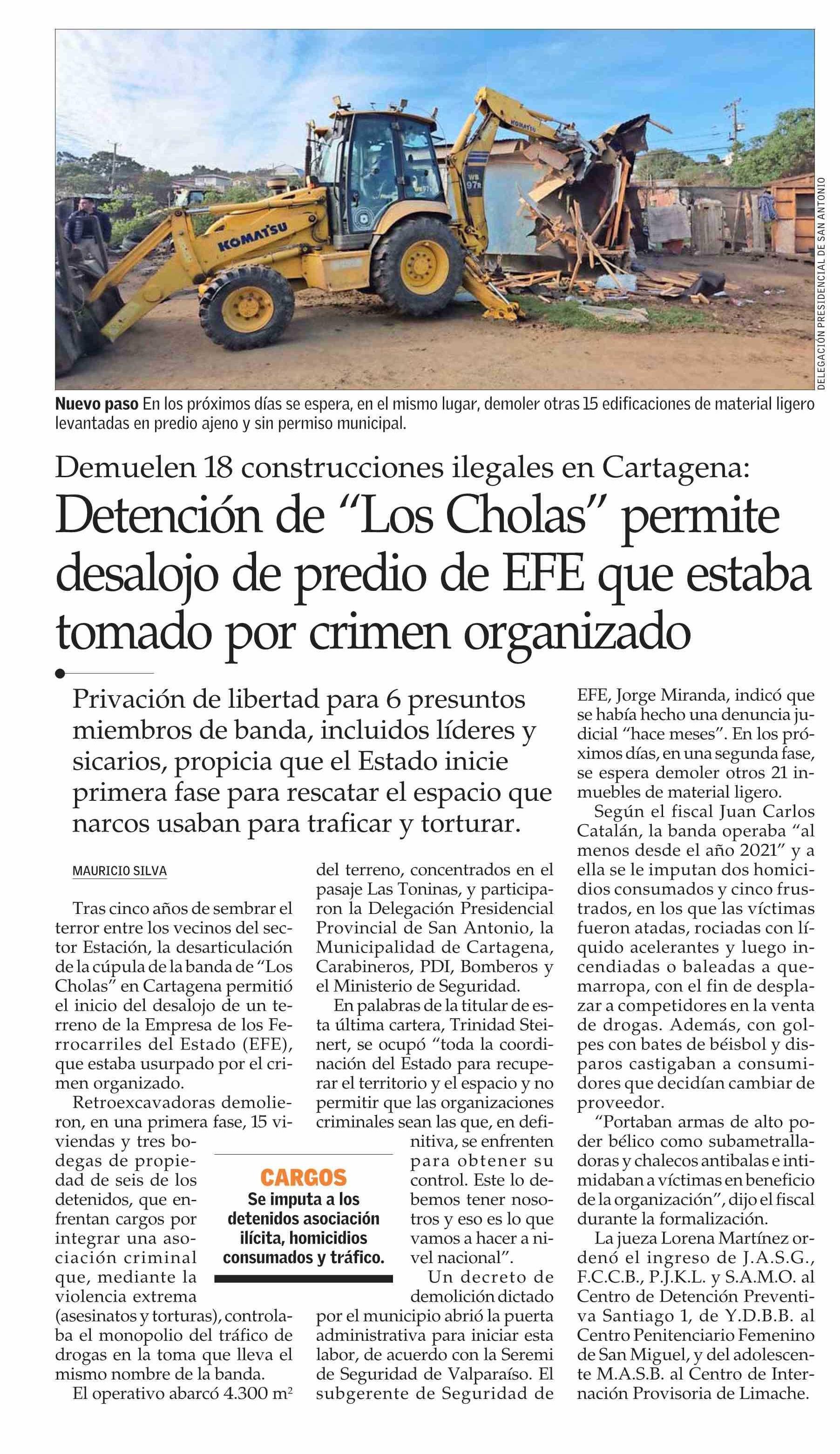 Detención de "Los Cholas" permite desalojo de predio de EFE que estaba tomado por crimen organizado 24-04-2026 El Mercurio |