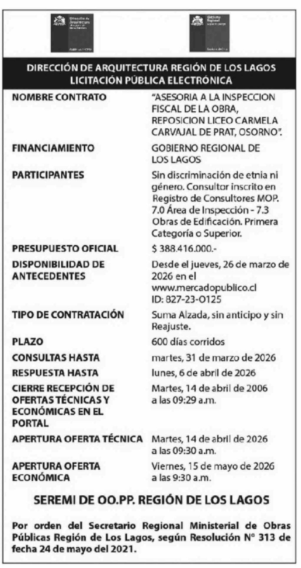 | Fecha: | 26-03-2026 | Sector: | Aviso Licitaciones | Región: | Región de Los Lagos |