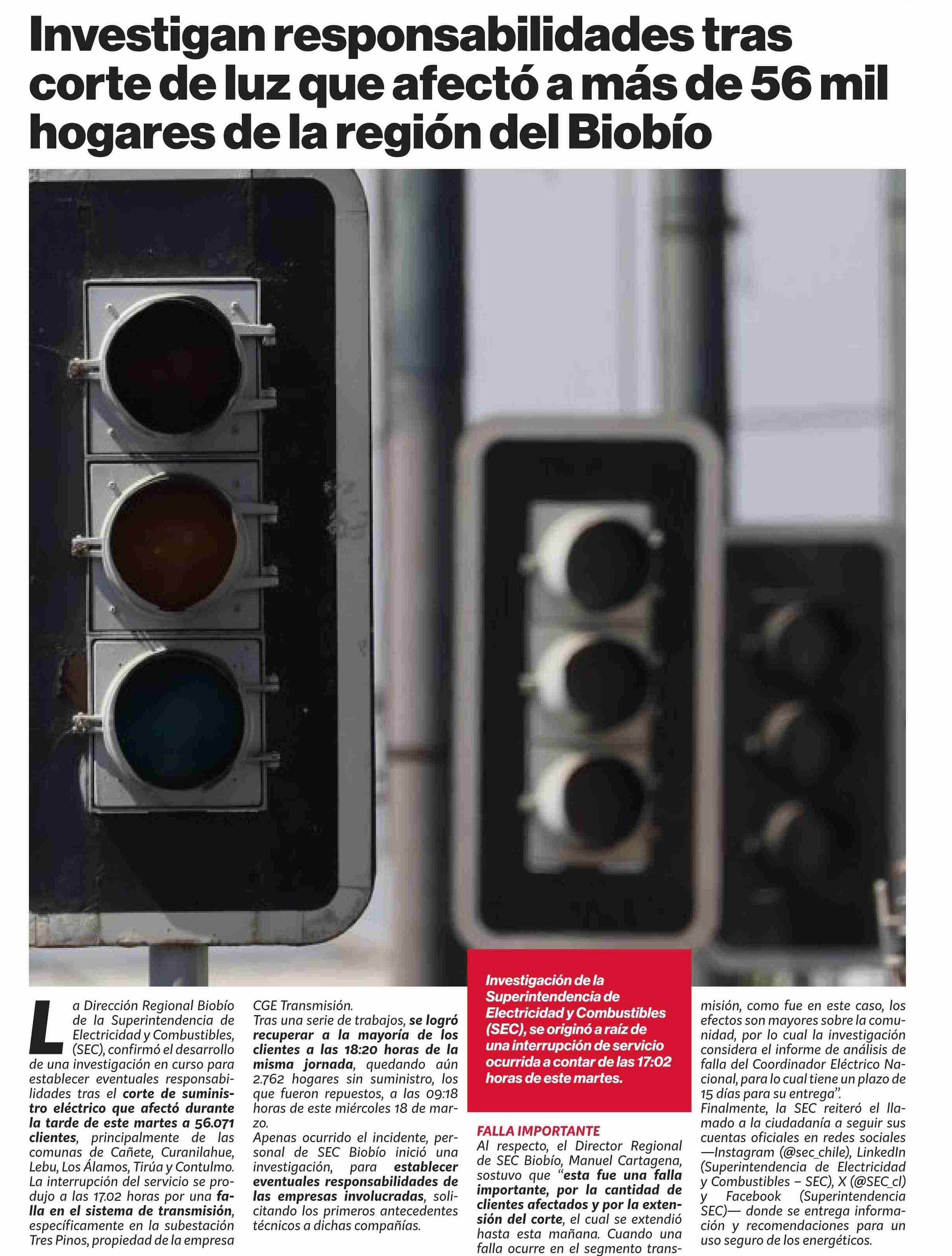Título: Investigan responsabilidades tras corte de luz que afectó a más de 56 mil hogares de la región del Biobío