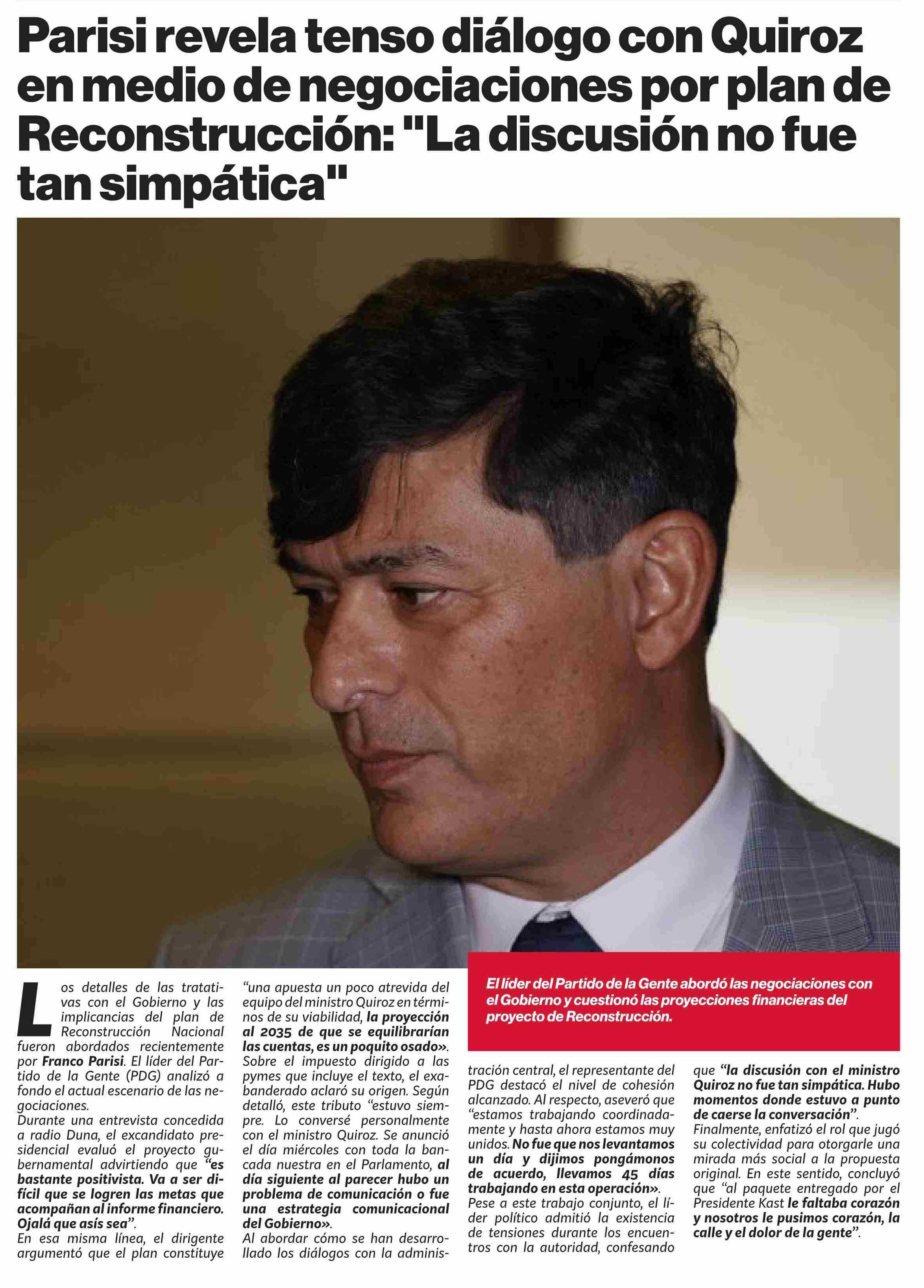 Parisi revela tenso diálogo con Quiroz en medio de negociaciones por plan de Reconstrucción: "La discusión no fue tan simpática" 24-04-2026 Puranoticia.cl |
