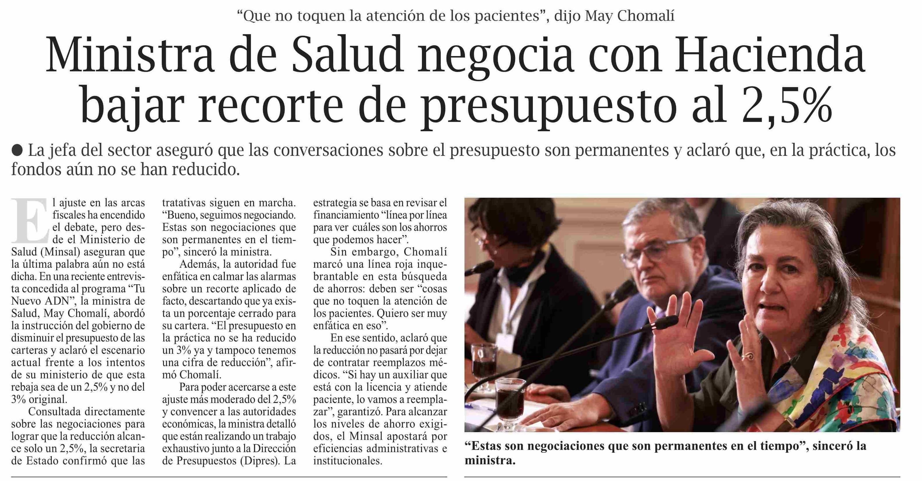 | Título: | Ministra de Salud negocia con Hacienda bajar recorte de presupuesto al 2,5% |