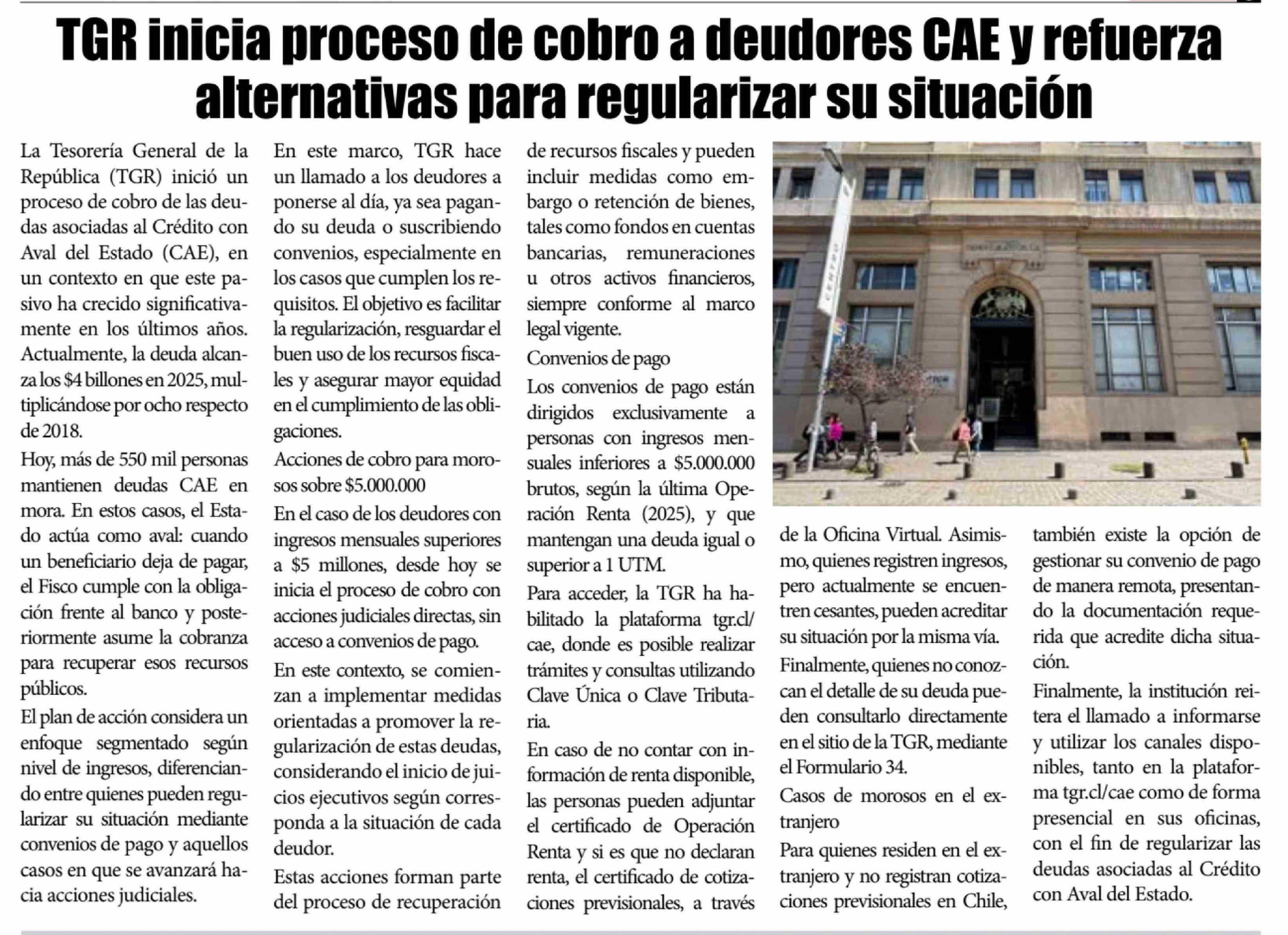 Título: TGR inicia proceso de cobro a deudores CAE y refuerza alternativas para regularizar su situación