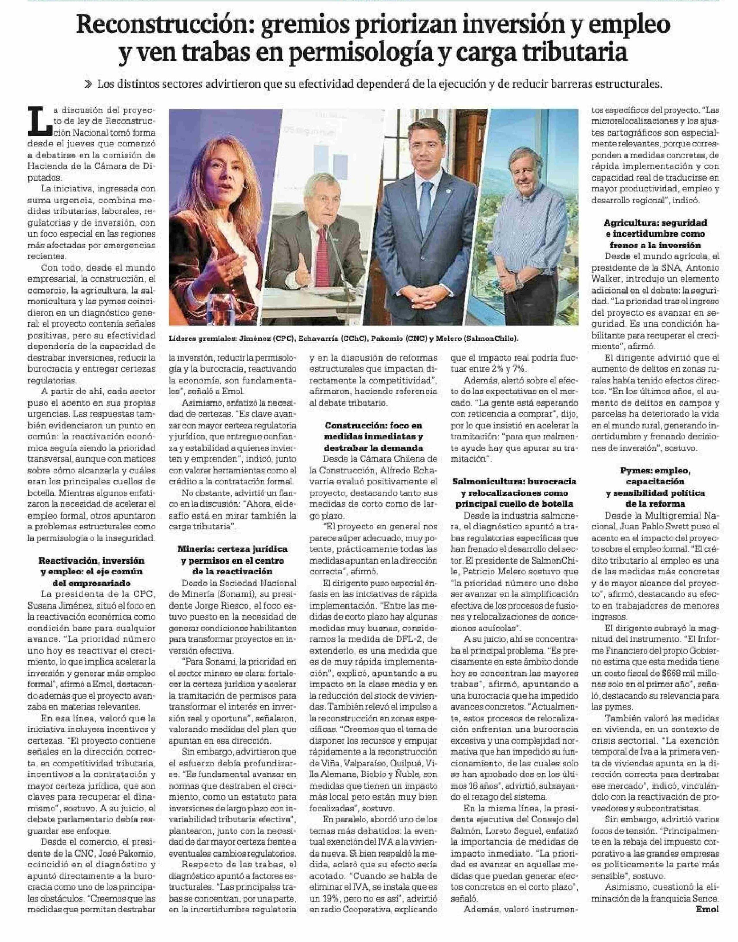 | Título: | Reconstrucción: gremios priorizan inversión y empleo y ven trabas en permisología y carga tributaria |