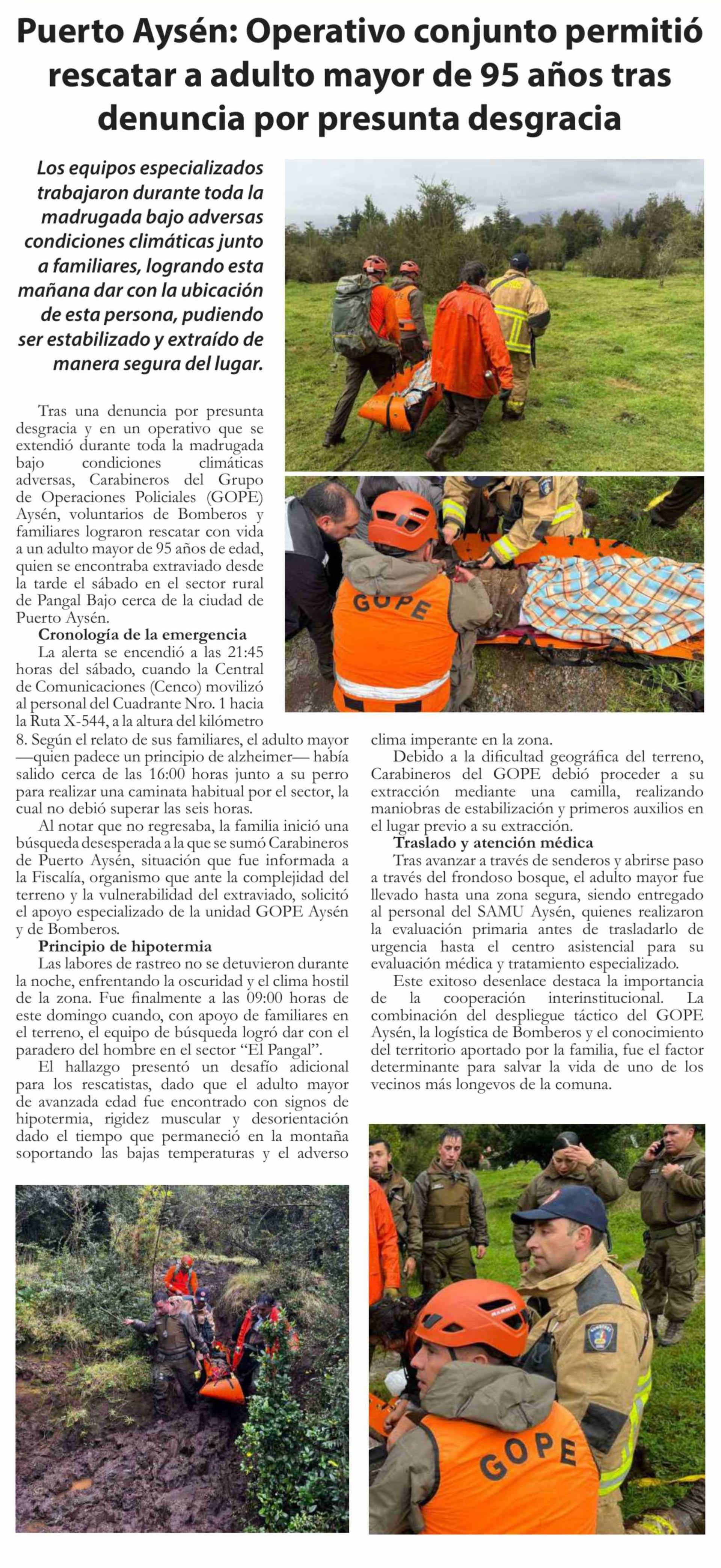 | Título: | Puerto Aysén: Operativo conjunto permitió rescatar a adulto mayor de 95 años tras denuncia por presunta desgracia |