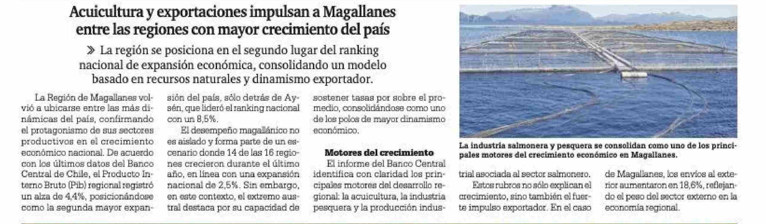 Acuicultura y exportaciones impulsan a Magallanes entre las regiones con mayor crecimiento del país 25-04-2026 La Prensa Austral |