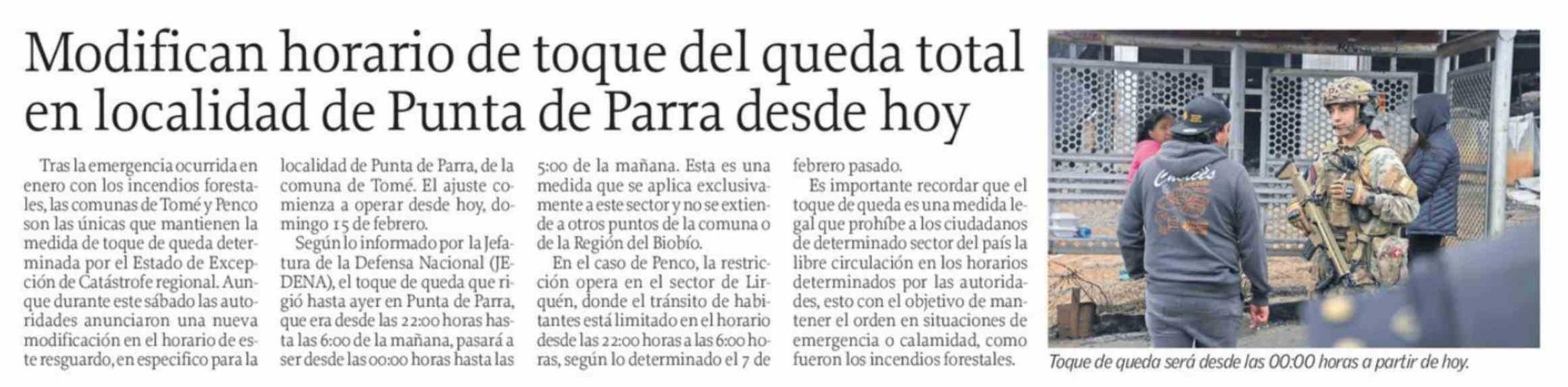 Título: Modifican horario de toque del queda total en localidad de Punta de Parra desde hoy