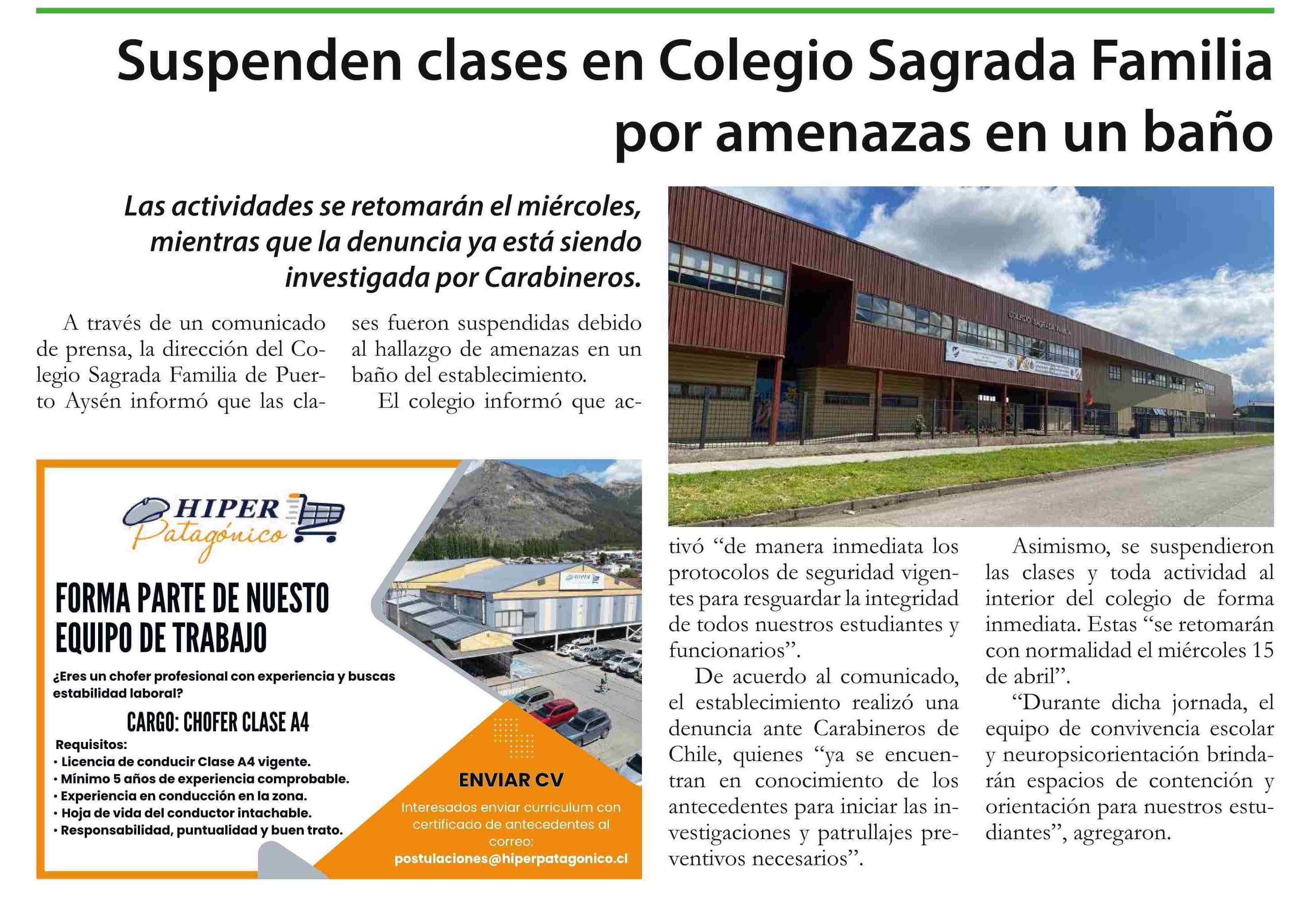 Suspenden clases en Colegio Sagrada Familia por amenazas en un baño 14-04-2026 El Divisadero |
