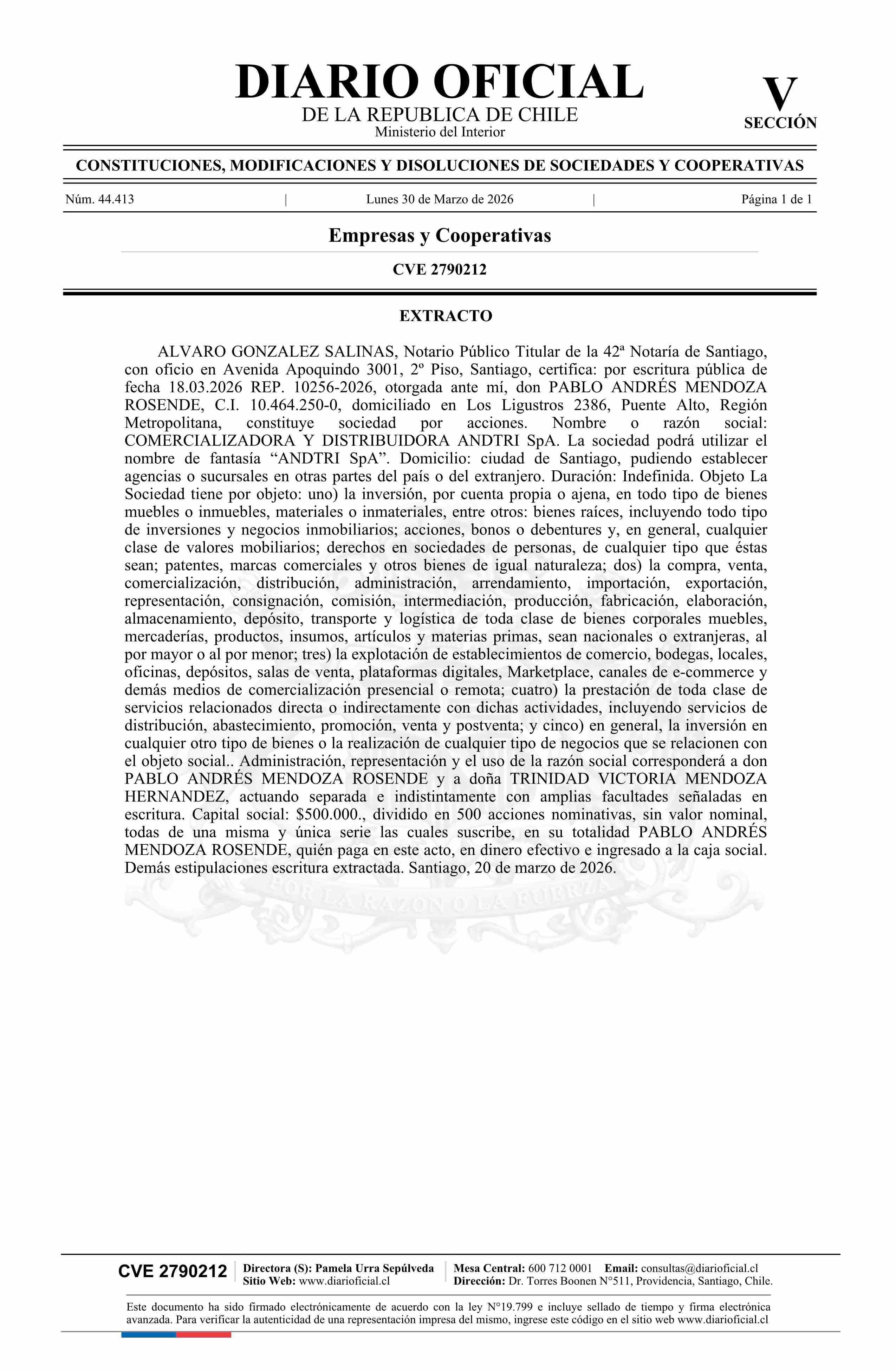 COMERCIALIZADORA Y DISTRIBUIDORA ANDTRI SpA 30-03-2026 Diario Oficial Edición Electrónica |