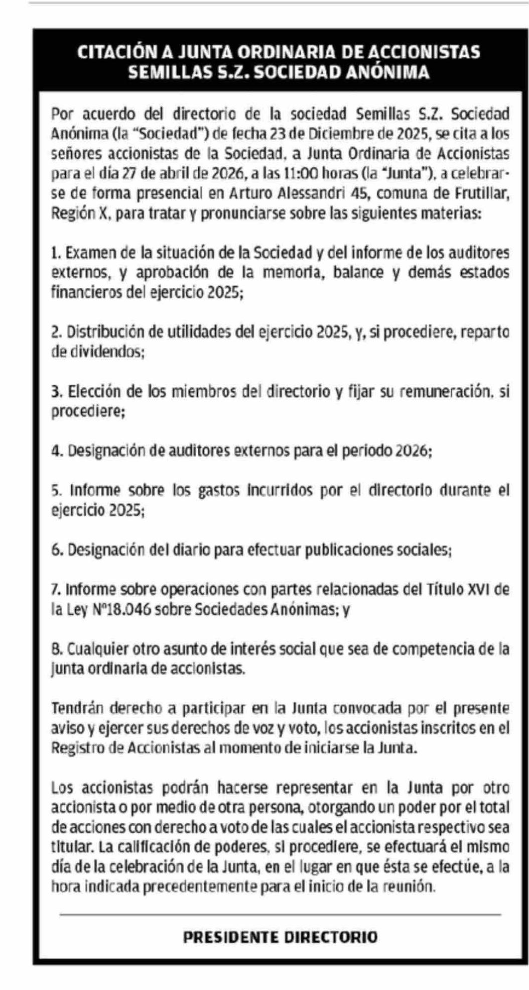 Título: CITACIÓN A JUNTA ORDINARIA DE ACCIONISTAS SEMILLAS 5.Z. SOCIEDAD ANONIMA