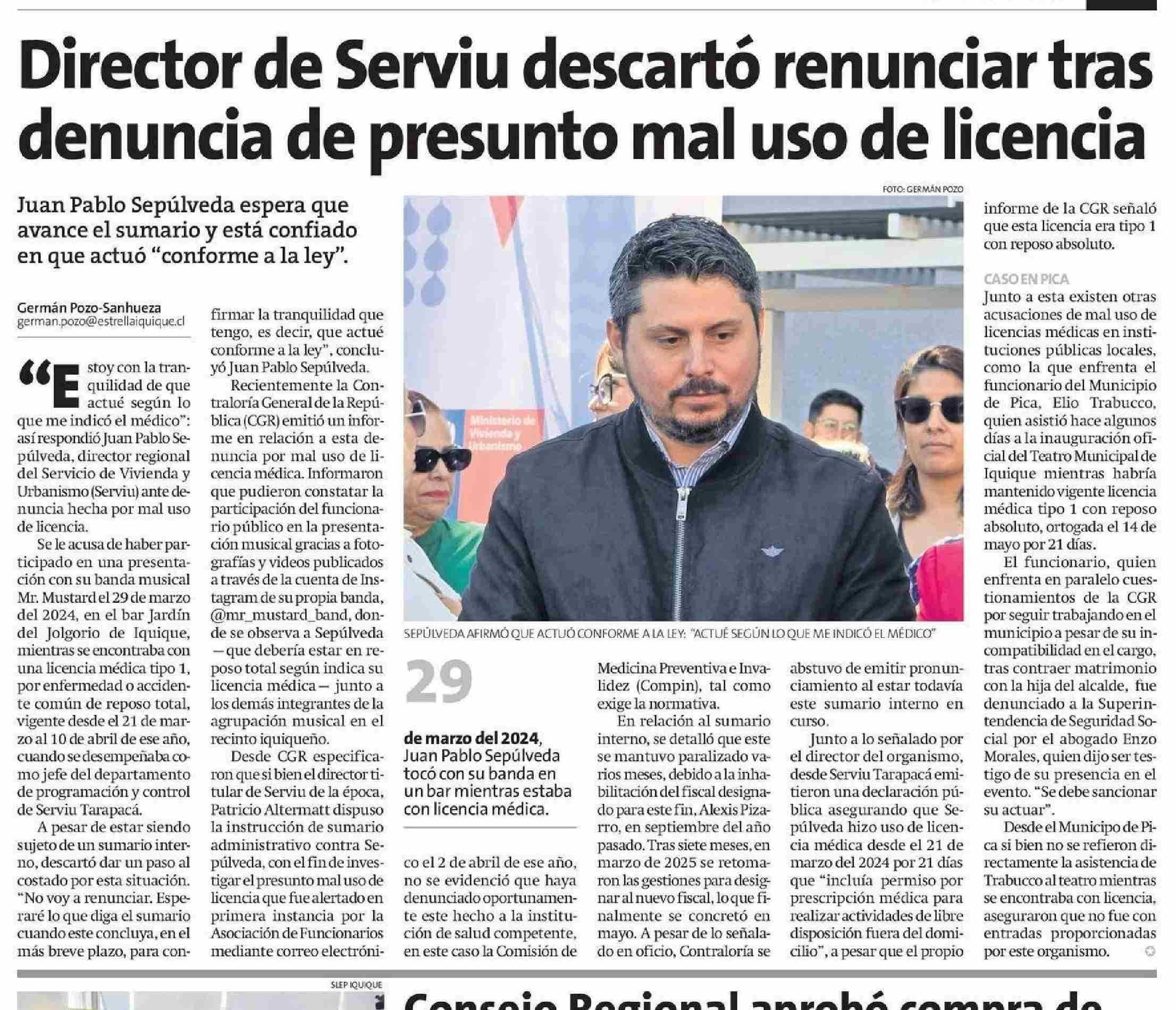 Director de Serviu descartó renunciar tras denuncia de presunto mal uso de licencia 31-05-2025 La Estrella de Iquique |