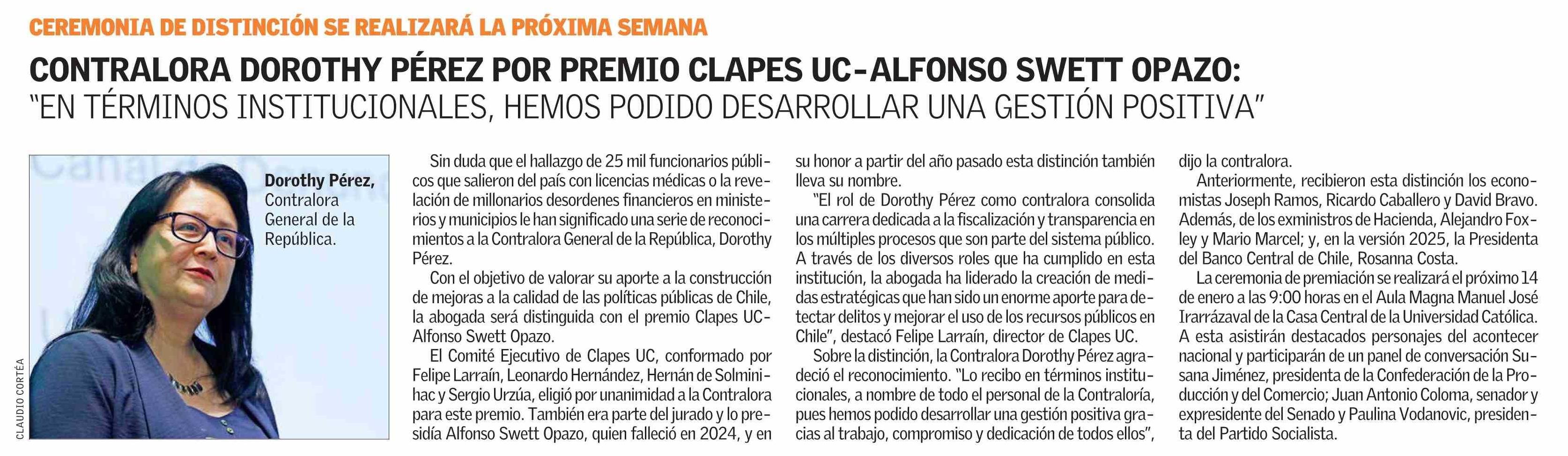 Título: CONTRALORA DOROTHY PÉREZ POR PREMIO CLAPES UC-ALFONSO SWETT OPAZO: “EN TÉRMINOS INSTITUCIONALES, HEMOS PODIDO DESARROLLAR UNA GESTIÓN POSITIVA”