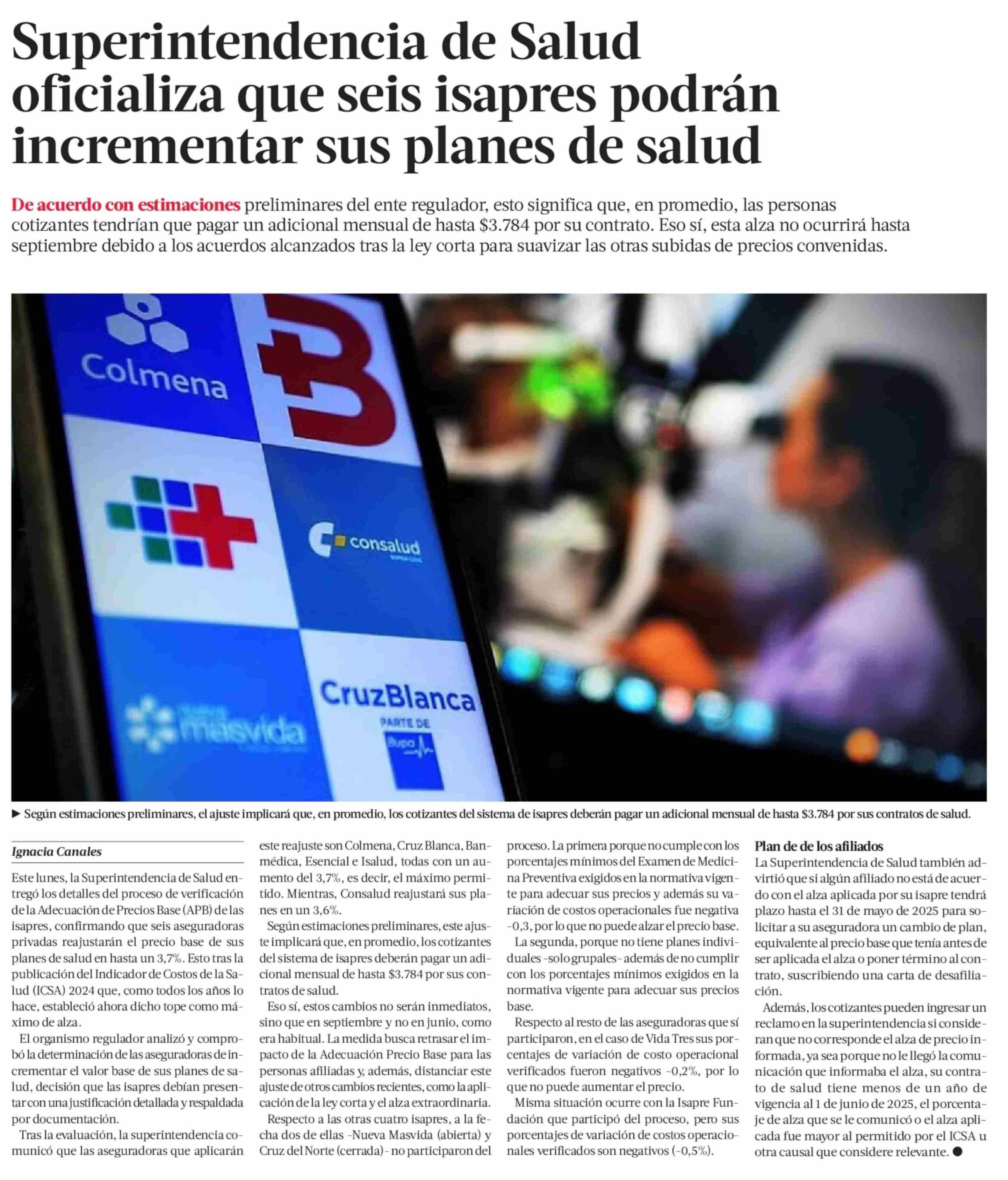 Superintendencia de Salud oficializa que seis isapres podrán incrementar sus planes de salud 18-03-2025 La Tercera |