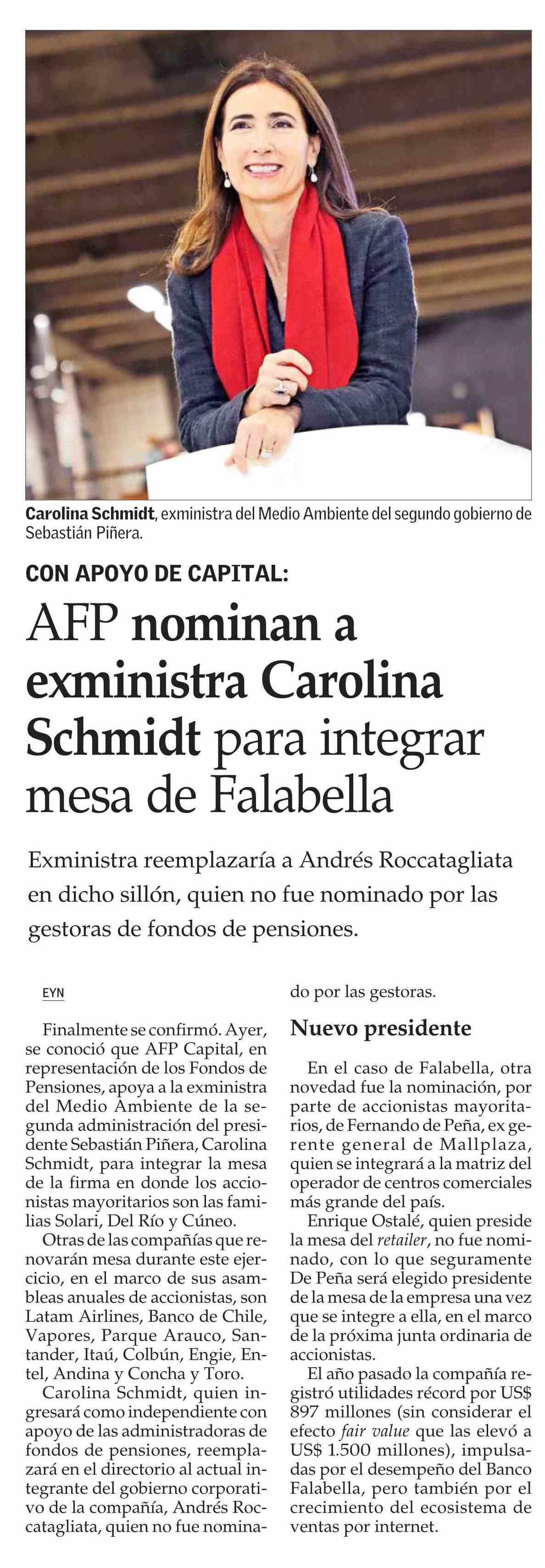Título: AFP nominan a exministra Carolina Schmidt para integrar mesa de Falabella