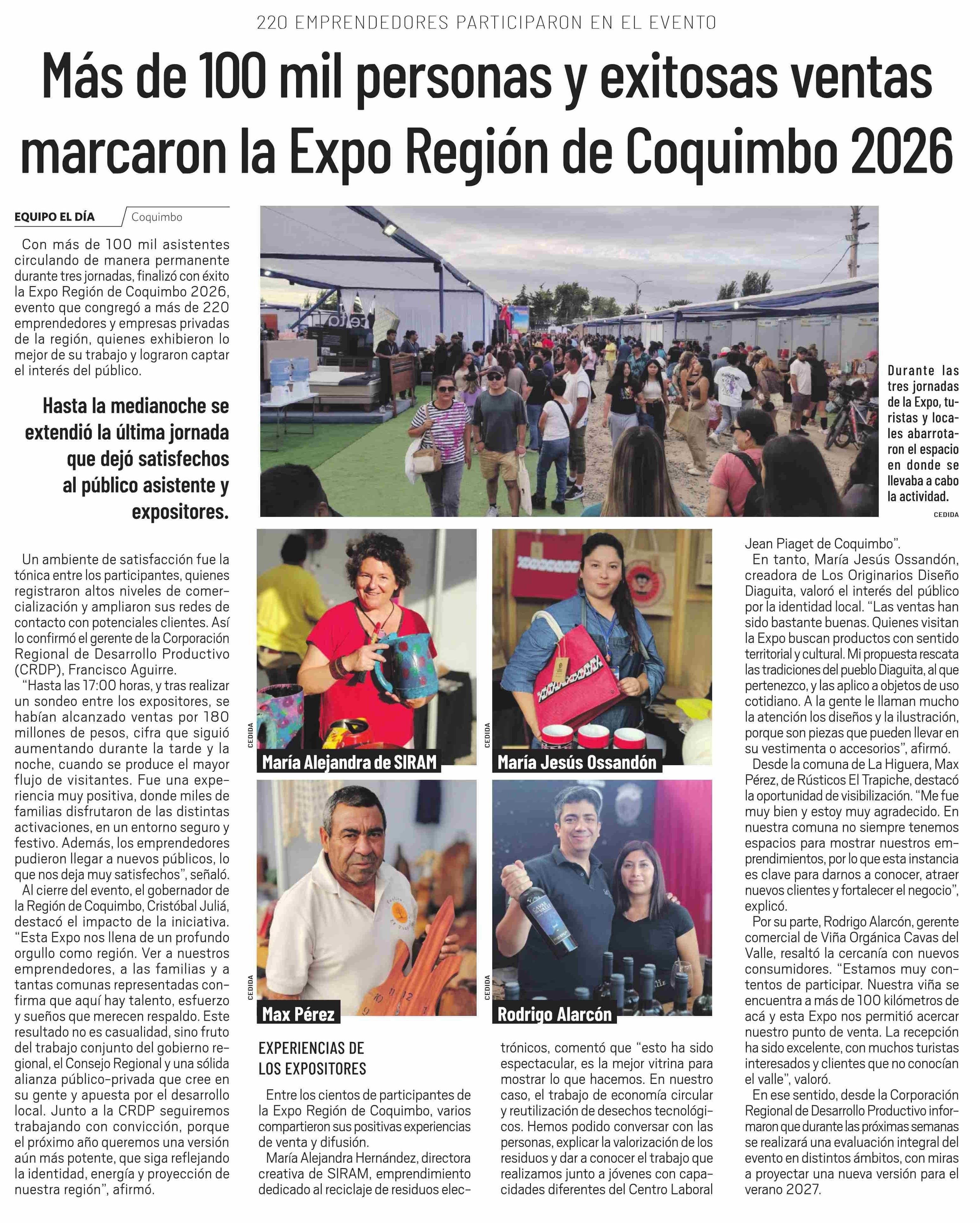 Más de 100 mil personas y exitosas ventas marcaron la Expo Región de Coquimbo 2026 26-01-2026 El Día |