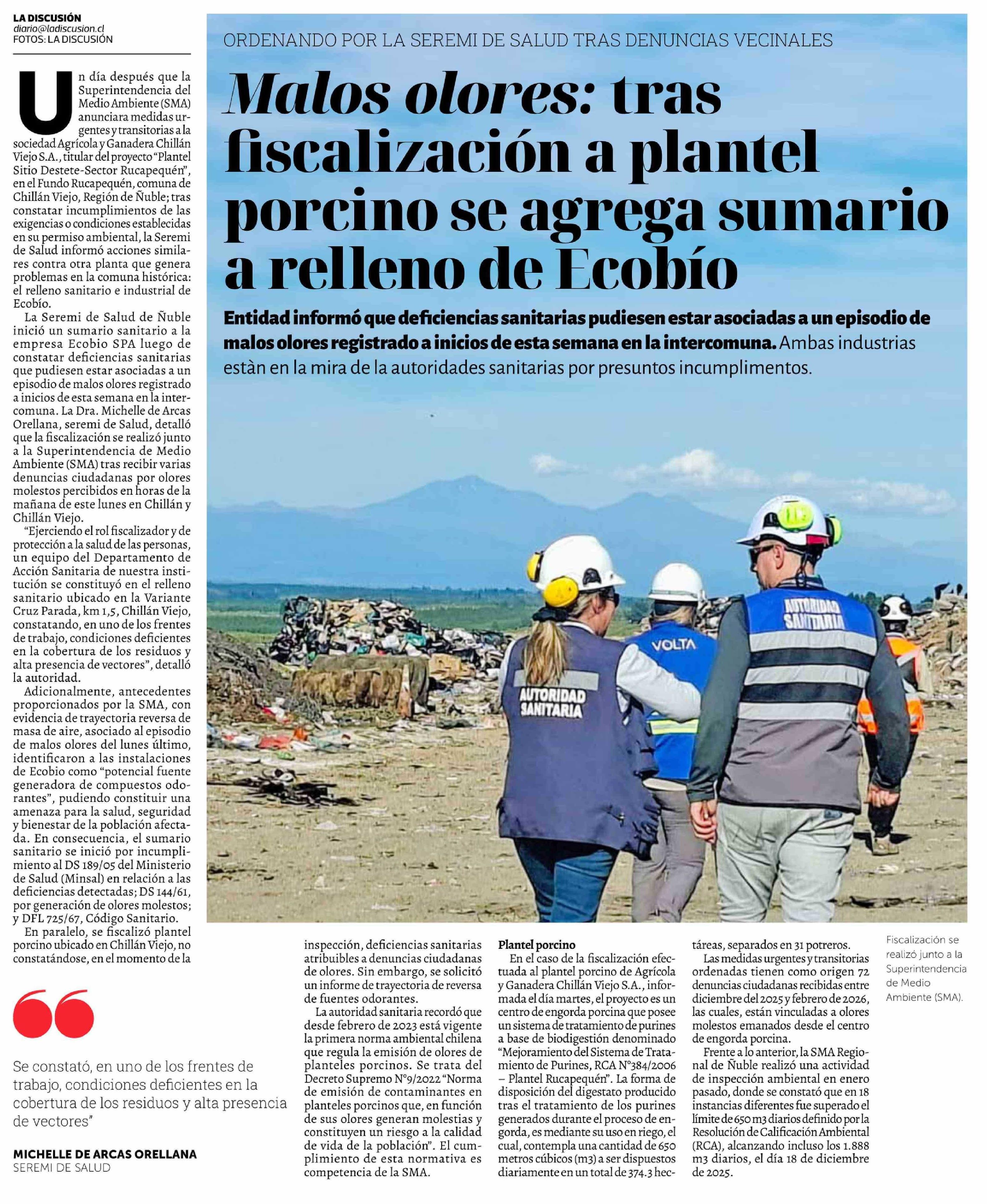 Malos olores: tras fiscalización a plantel porcino se agrega sumario a relleno de Ecobío 11-03-2026 La Discusión |