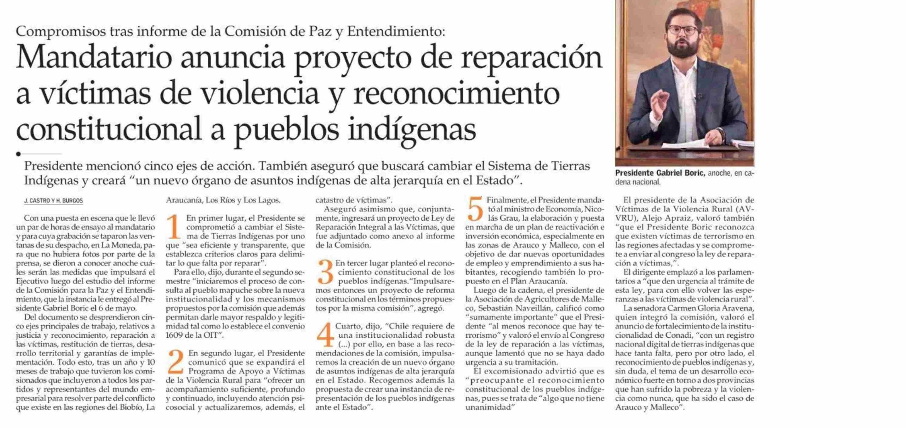 Mandatario anuncia proyecto de reparación a víctimas de violencia y reconocimiento constitucional a pueblos indígenas 23-05-2025 El Mercurio |