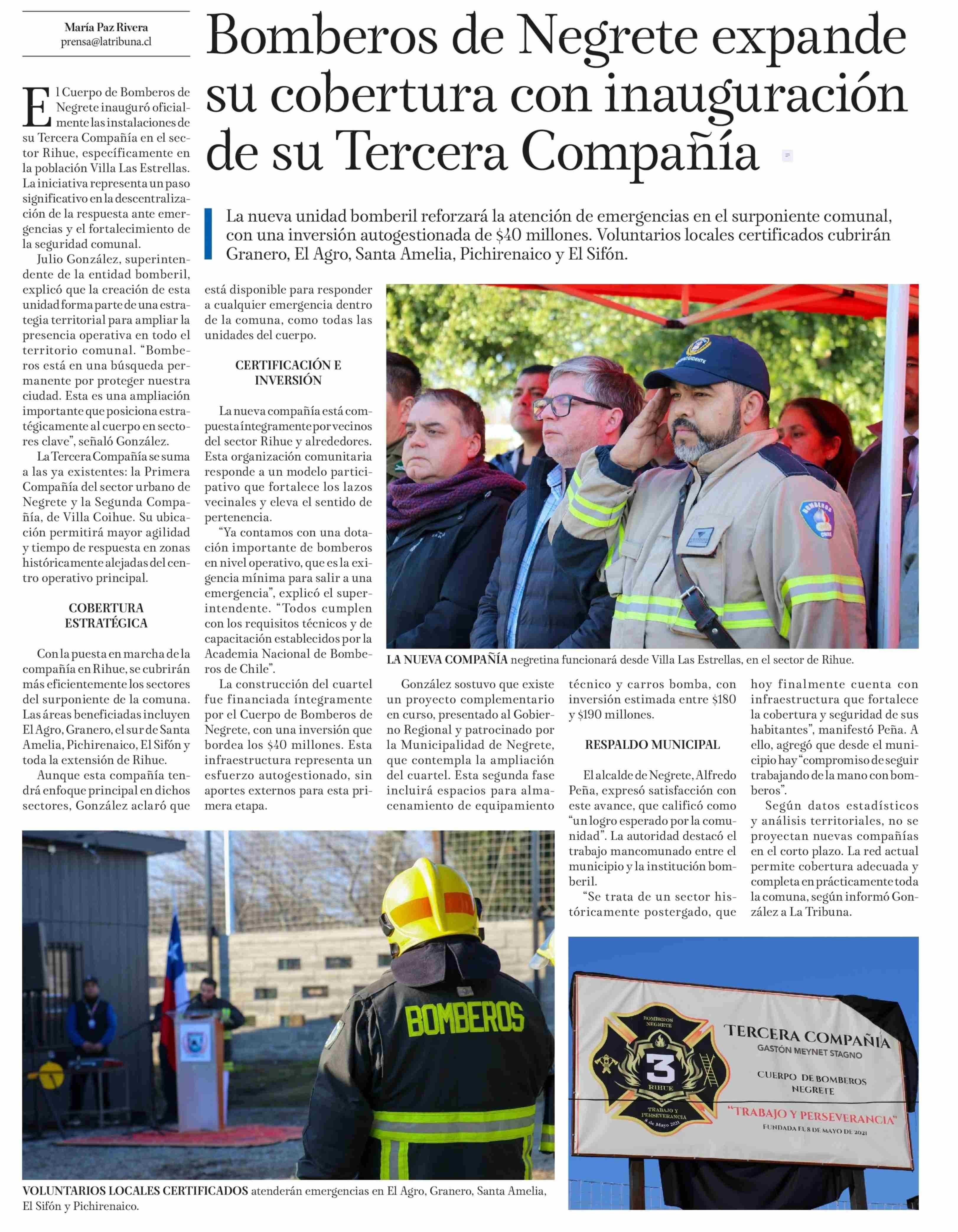Bomberos de Negrete expande su cobertura con inauguración de su Tercera Compañía 12-06-2025 La Tribuna |