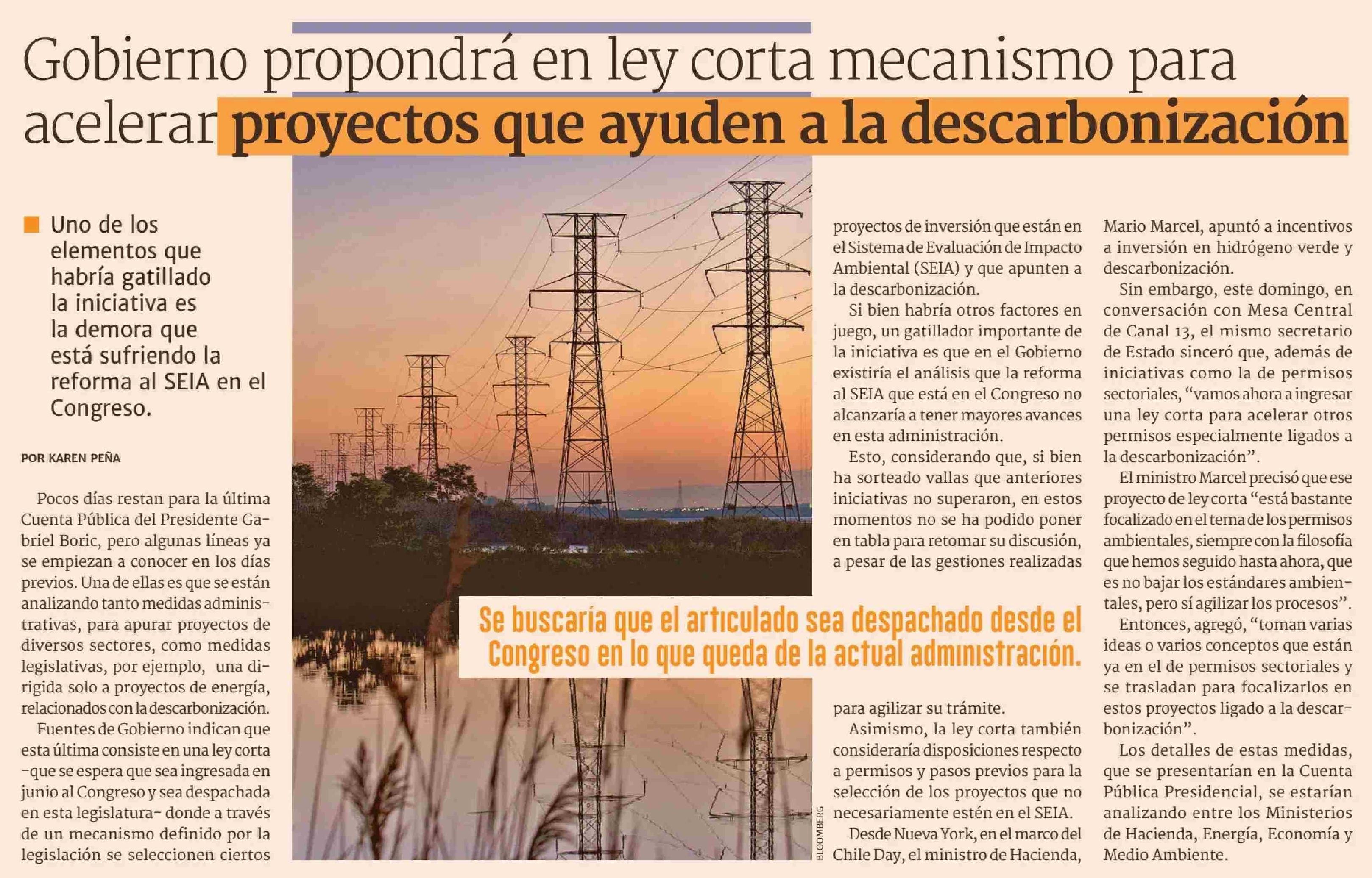 | Título: | Gobierno propondra en ley corta mecanismo para acelerar proyectos que auden a la descarbonización |