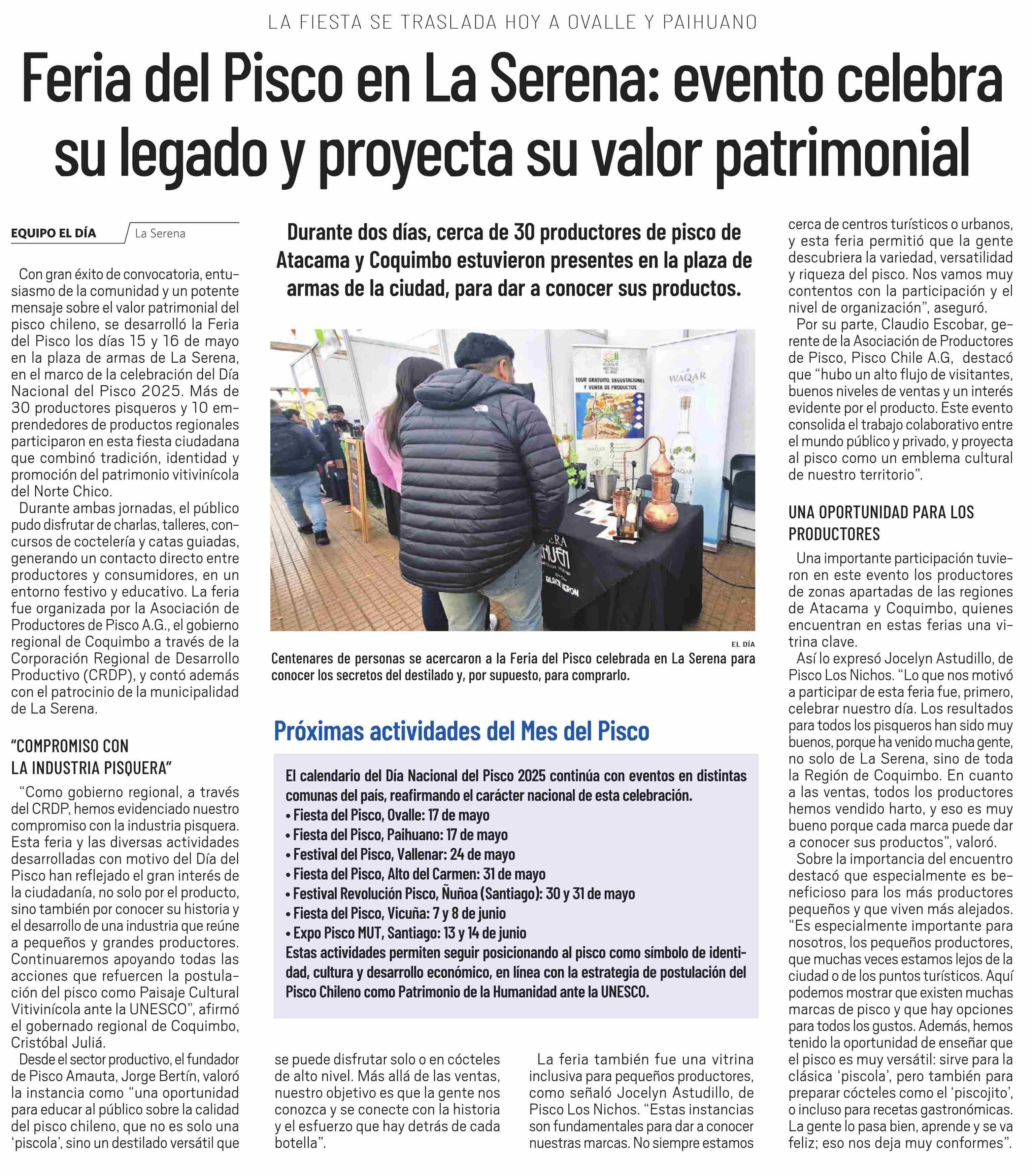 Feria del Pisco en La Serena: evento celebra su legado y proyecta su valor patrimonial 17-05-2025 El Día |