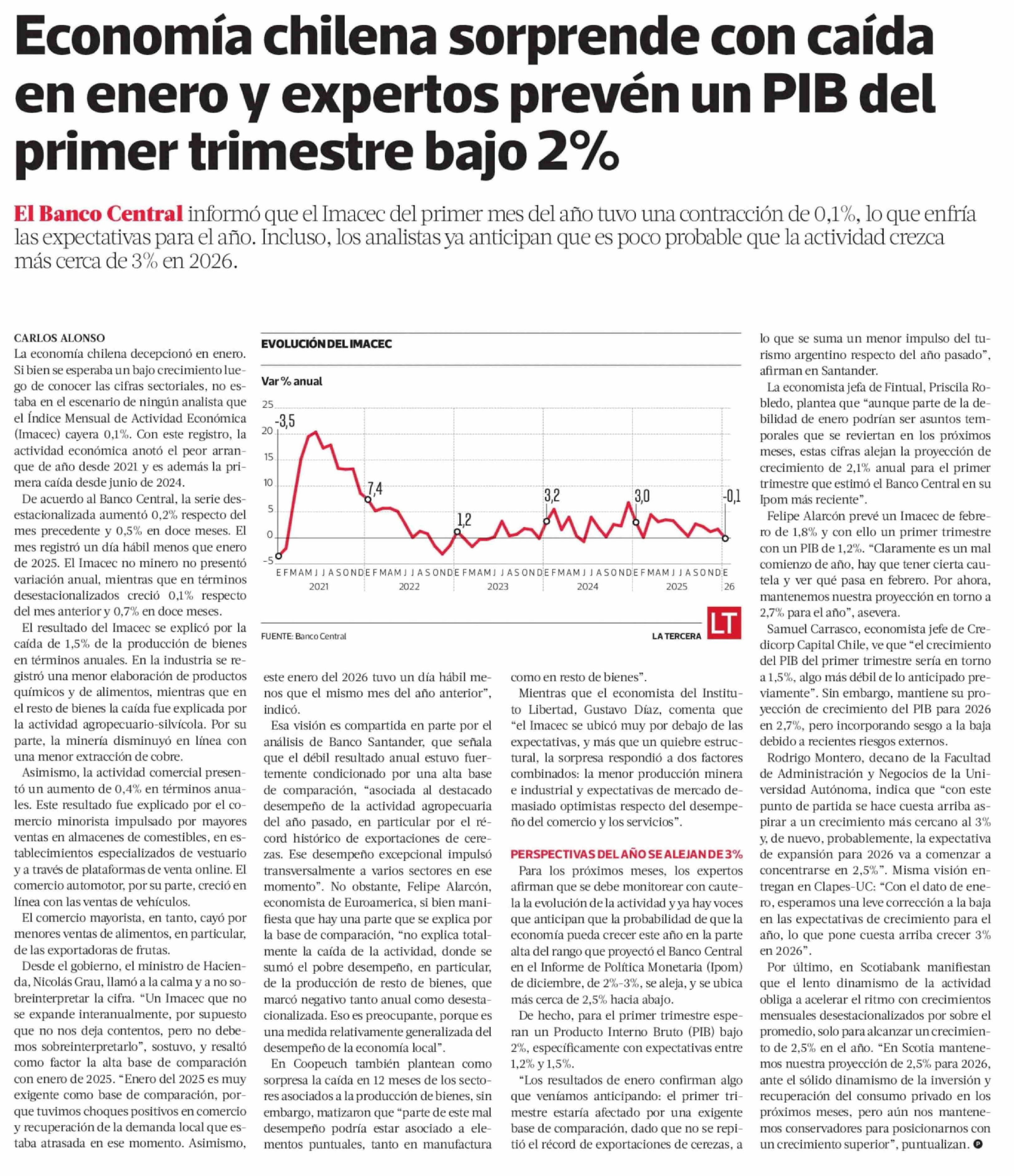 Título: Economía chilena sorprende con caída en enero y expertos prevén un PIB del primer trimestre bajo 2%
