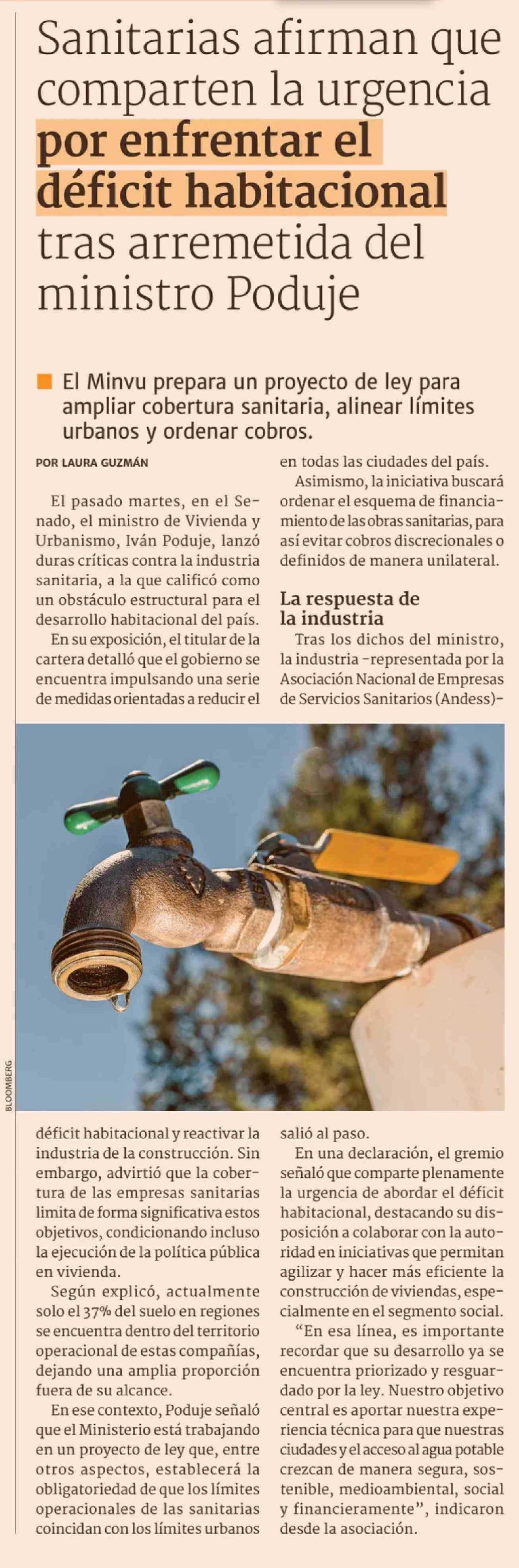 Sanitarias afirman que comparten la urgencia por enfrentar el déficit habitacional tras arremetida del ministro Poduje 09-04-2026 Diario Financiero |
