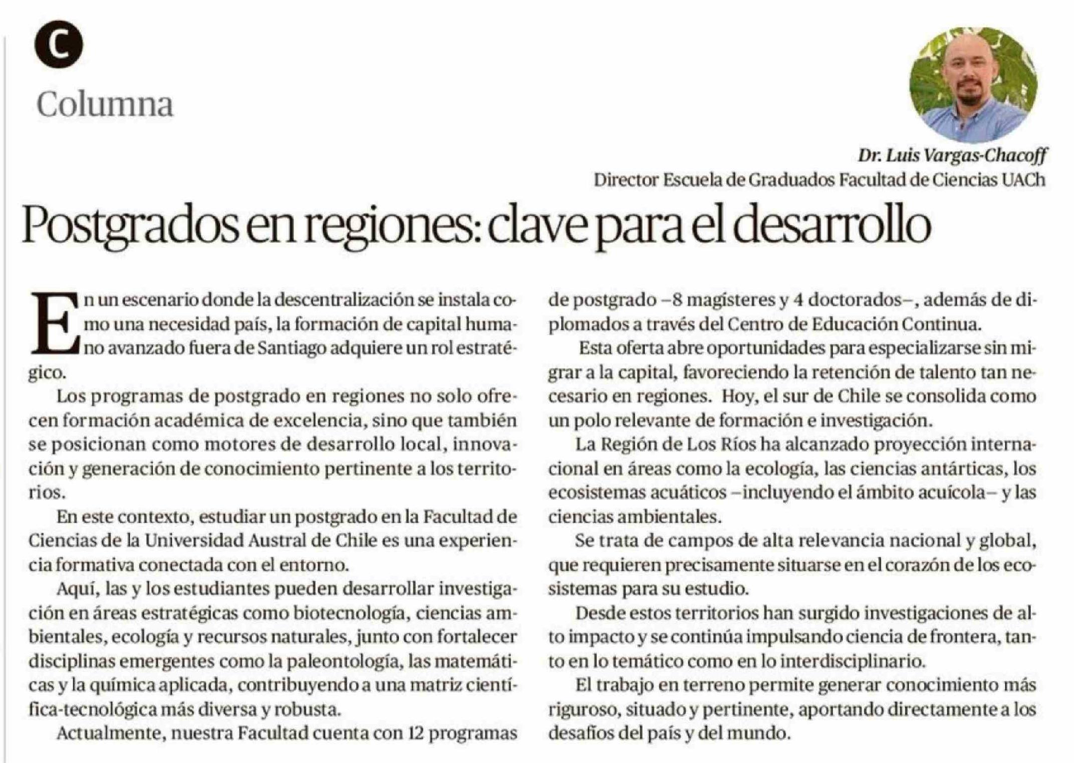Columnas de Opinión: Postgrados en regiones: clave para el desarrollo 23-04-2026 Diario Austral Región de Los Ríos |