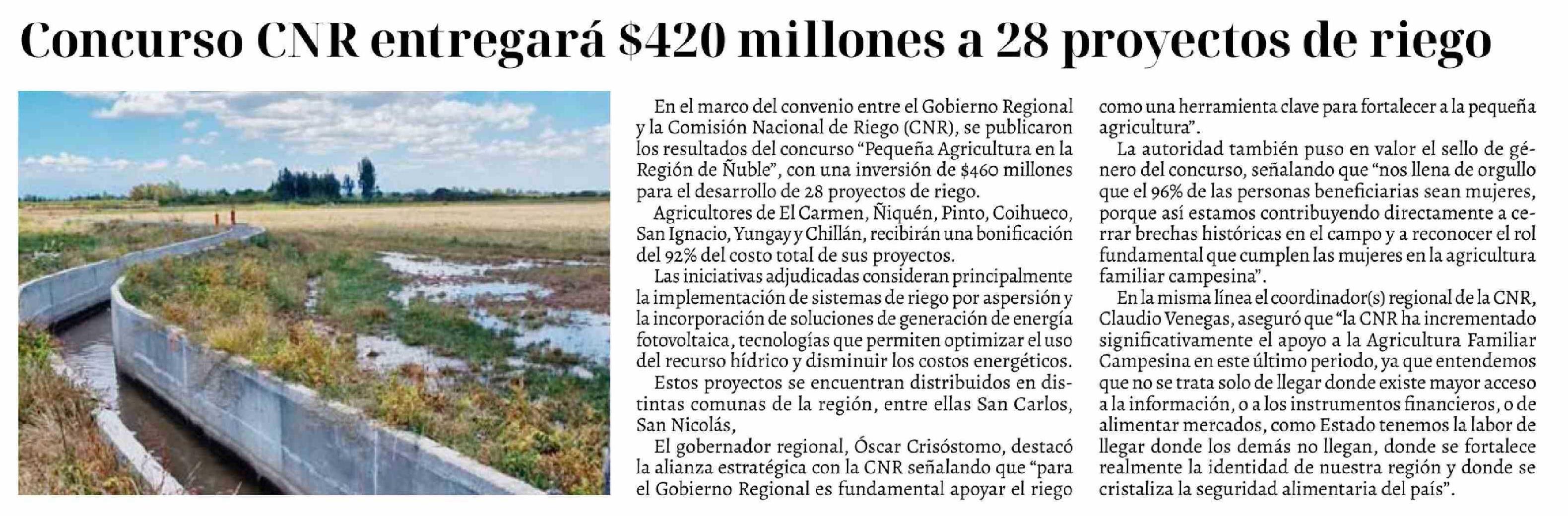 Concurso CNR entregará $420 millones a 28 proyectos de riego 21-02-2026 La Discusión |