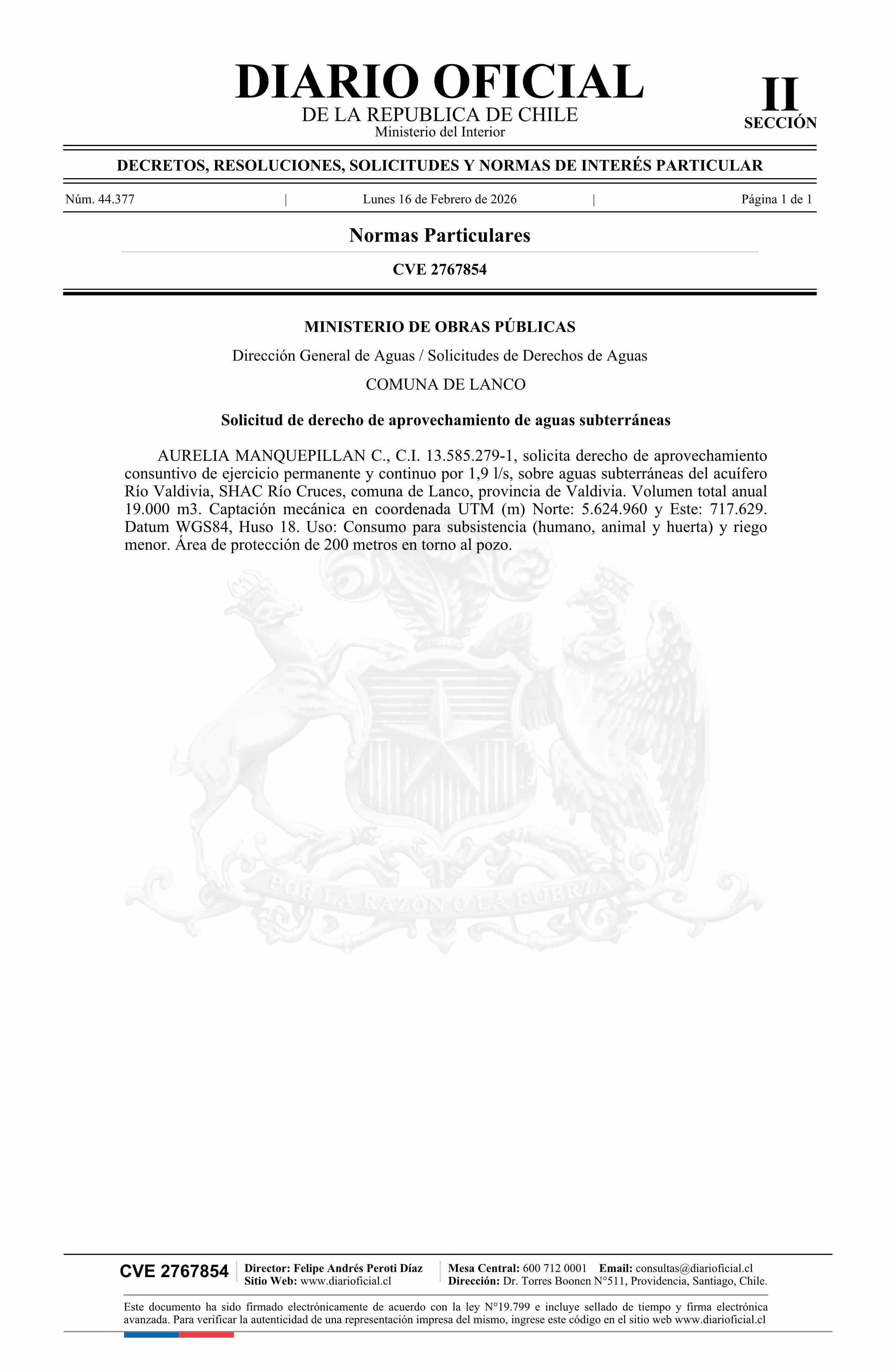 Solicitud Manquepillan C. Aurelia 16-02-2026 Diario Oficial Edición Electrónica |