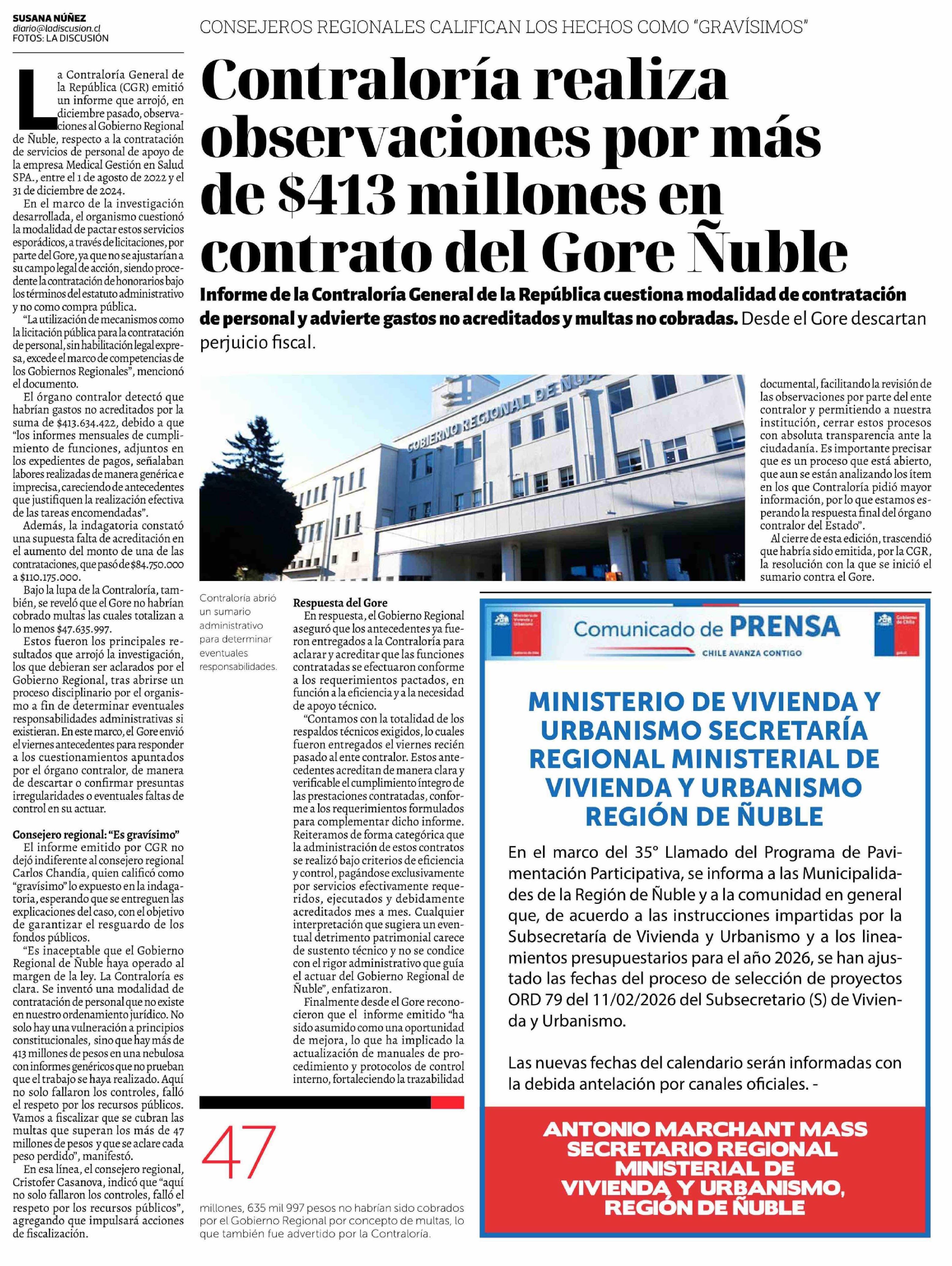 Contraloría realiza observaciones por más de $413 millones en contrato del Gore Nuble 17-02-2026 La Discusión |