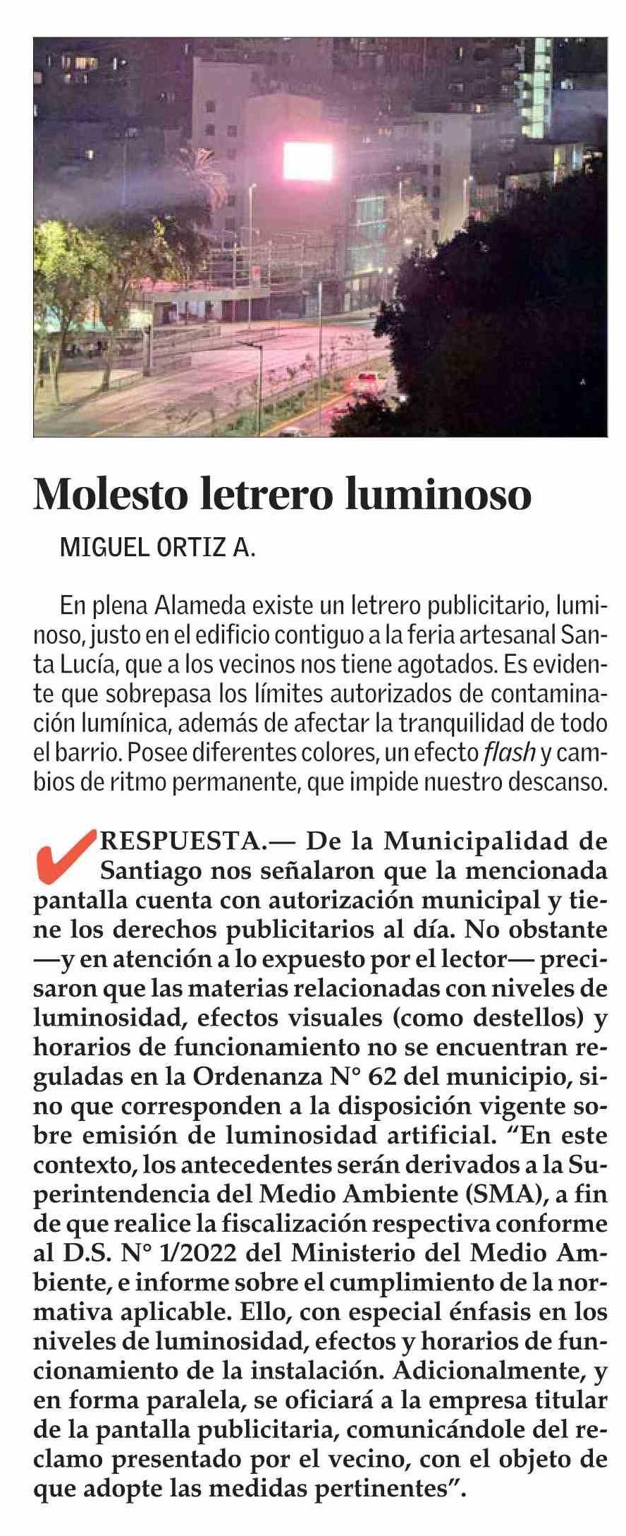Molesto letrero luminoso 20-04-2026 El Mercurio |