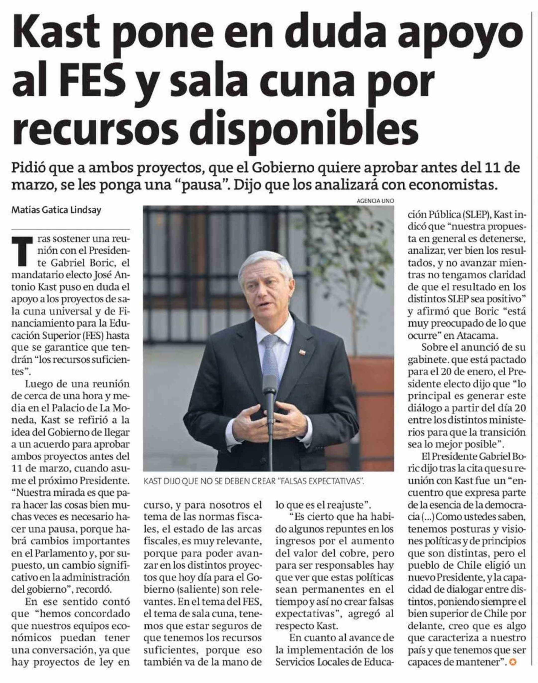 Título: Kast pone en duda apoyo al FES y sala cuna por recursos disponibles
