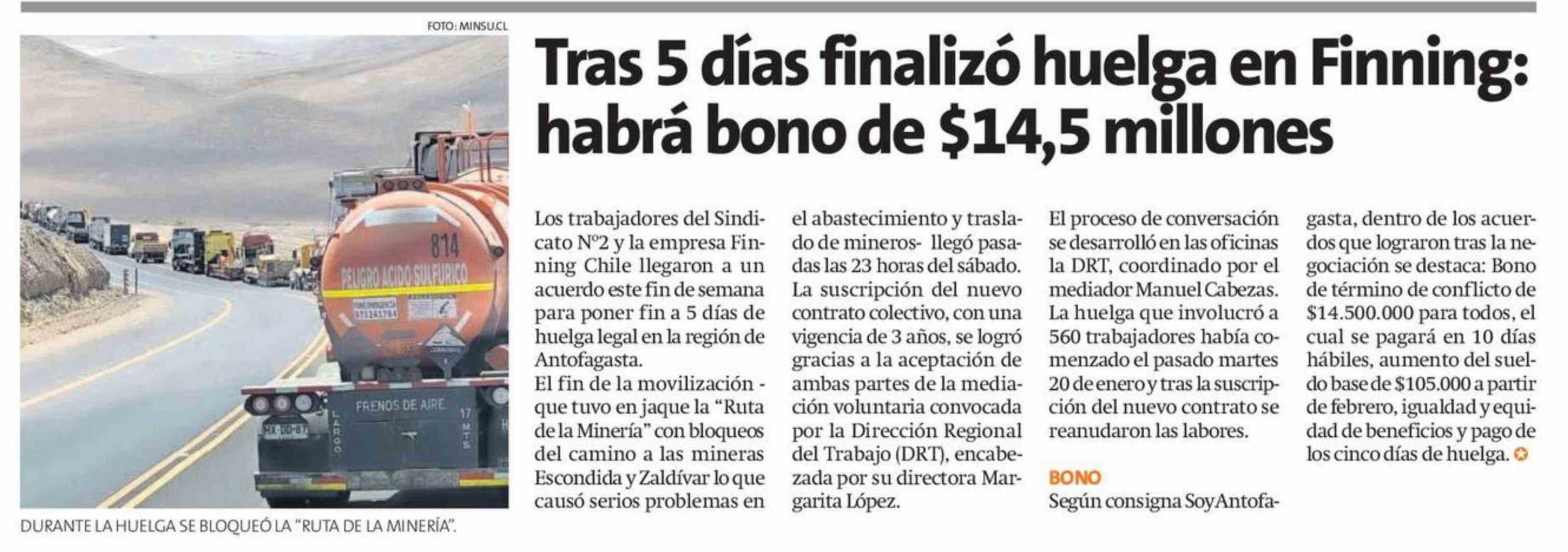 Tras 5 días finalizó huelga en Finning: habrá bono de $14,5 millones 26-01-2026 La Estrella de Antofagasta |