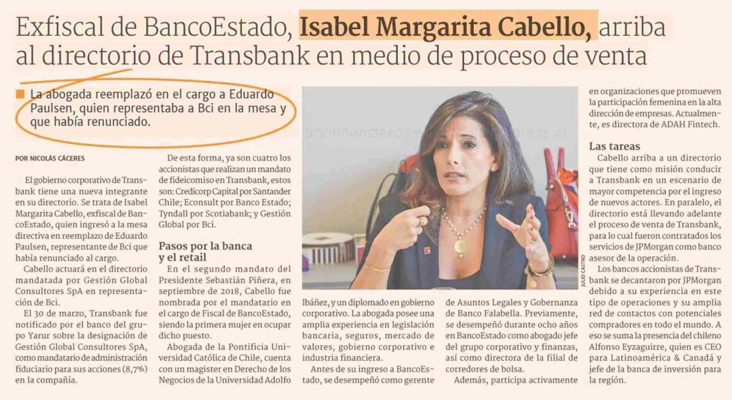 | Título: | Exfiscal de BancoEstado, Isabel Margarita Cabello, arriba al directorio de Transbank en medio de proceso de venta |
