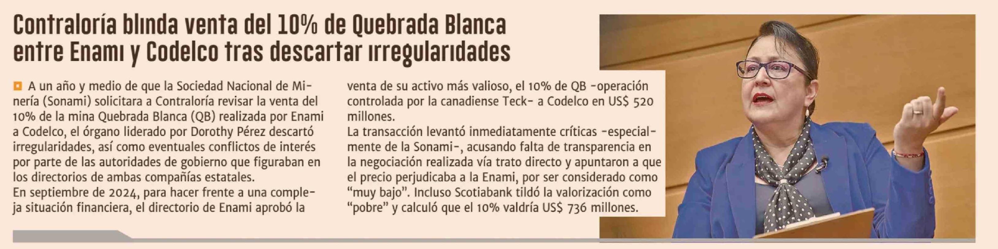 Contraloría blinda venta del 10% de Quebrada Blanca entre Enami y Codelco tras descartar irregularidades 16-04-2026 Diario Financiero |