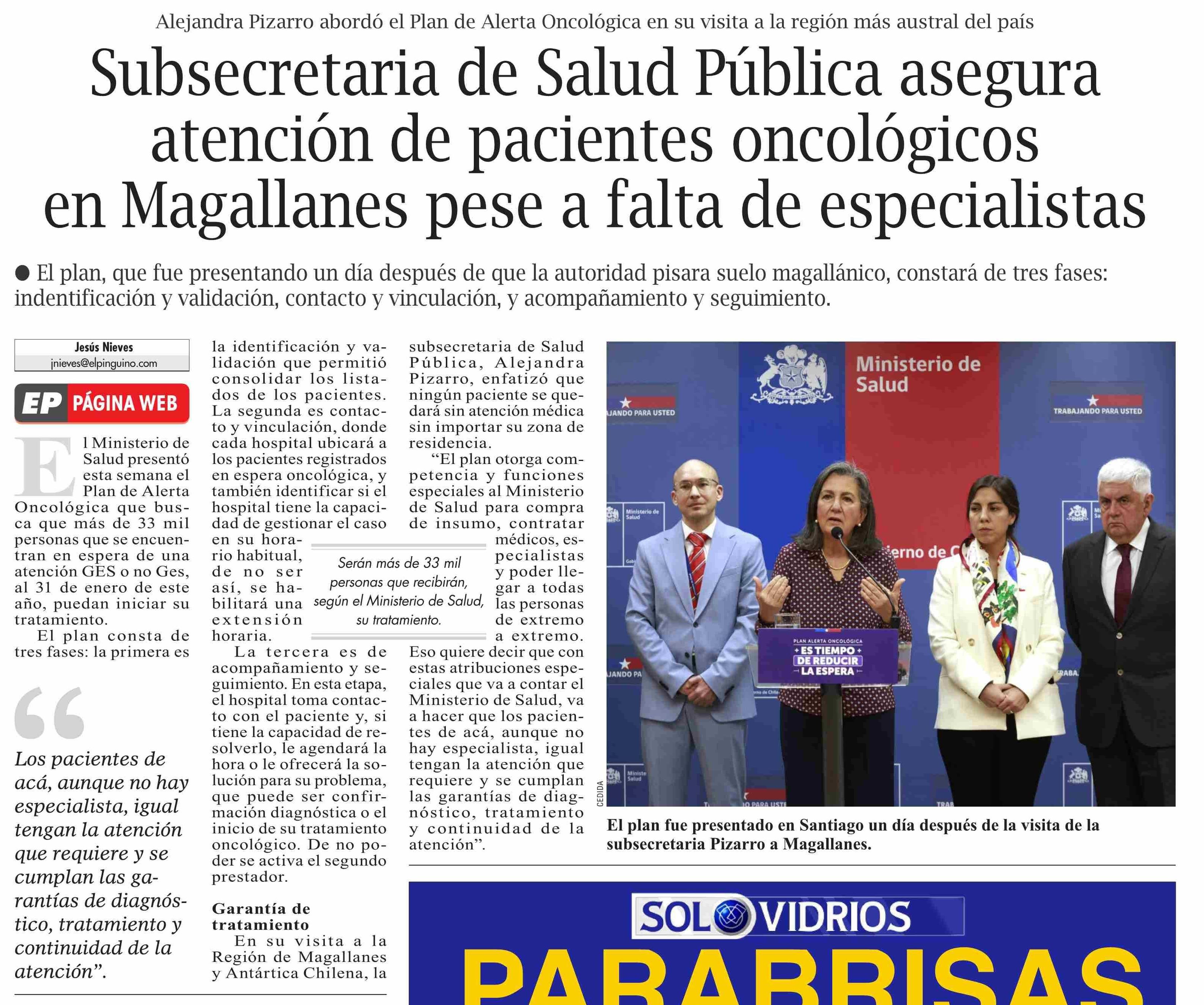 Subsecretaria de Salud Pública asegura atención de pacientes oncológicos en Magallanes pese a falta de especialistas 30-04-2026 El Pingüino |