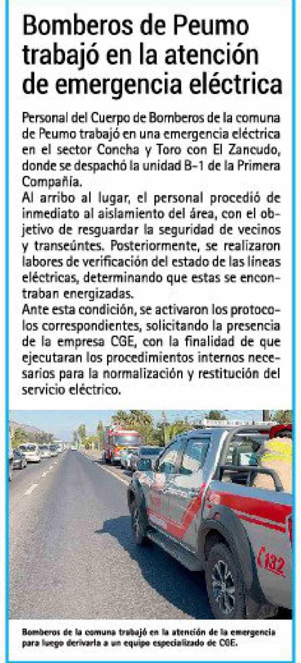 Título: Bomberos de Peumo trabajó en la atención de emergencia eléctrica