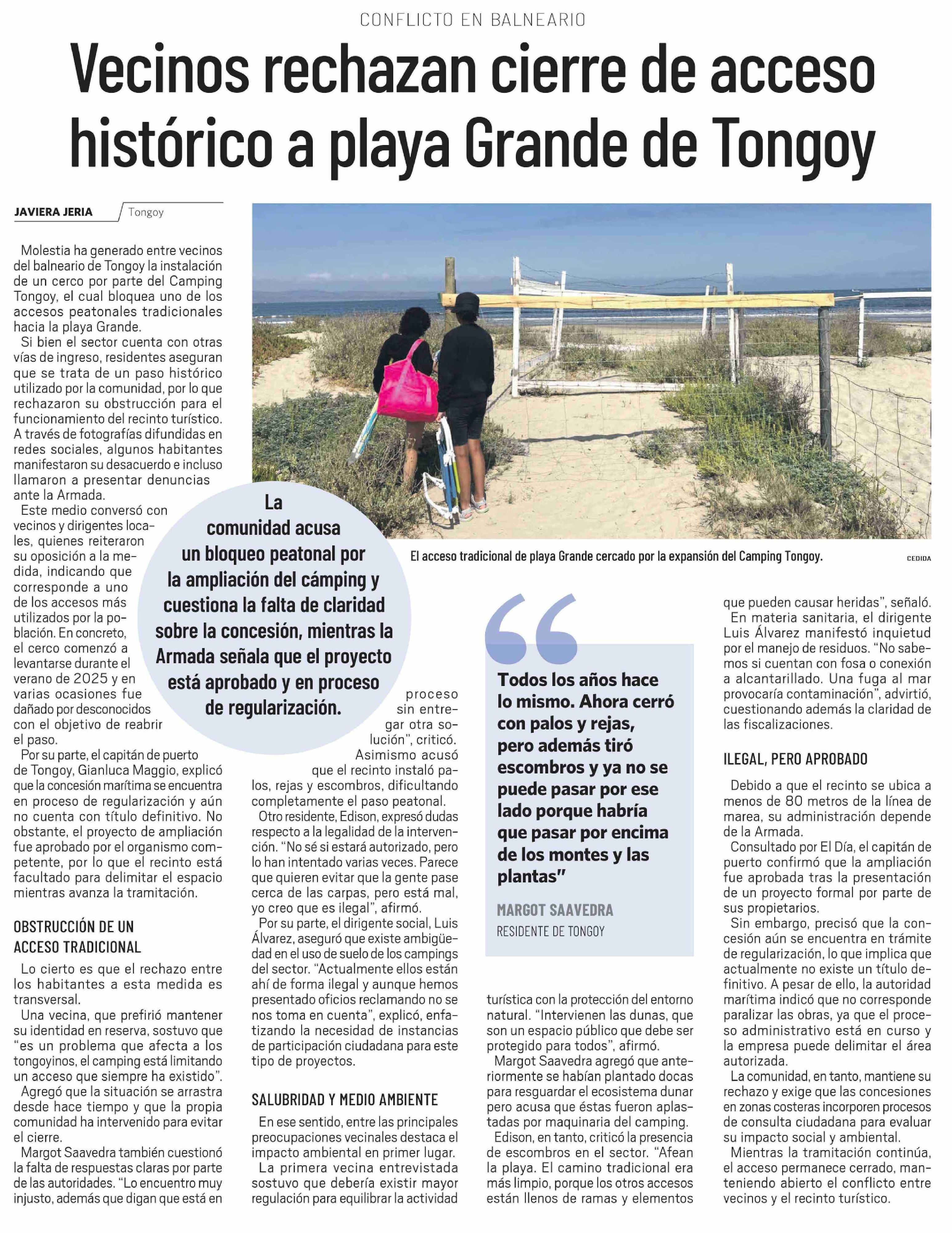 Vecinos rechazan cierre de acceso histórico a playa Grande de Tongoy 10-02-2026 El Día |