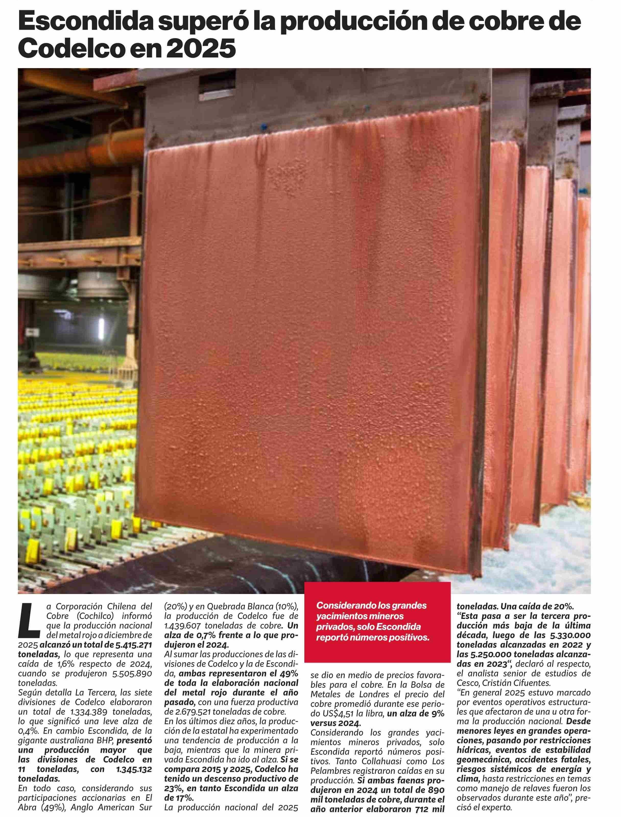 | Título: | Escondida superó la producción de cobre de Codelco en 2025 |