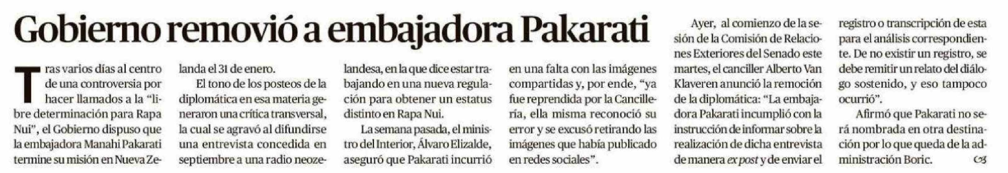 Gobierno removió a embajadora Pakarati 07-01-2026 El Mercurio de Valparaíso |