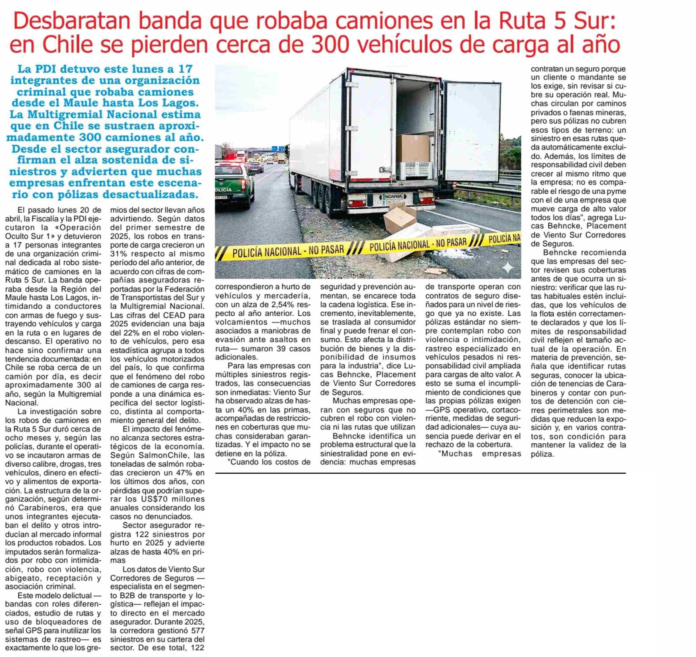 Título: Desbaratan banda que robaba camiones en la Ruta 5 Sur: en Chile se pierden cerca de 300 vehículos de carga al año