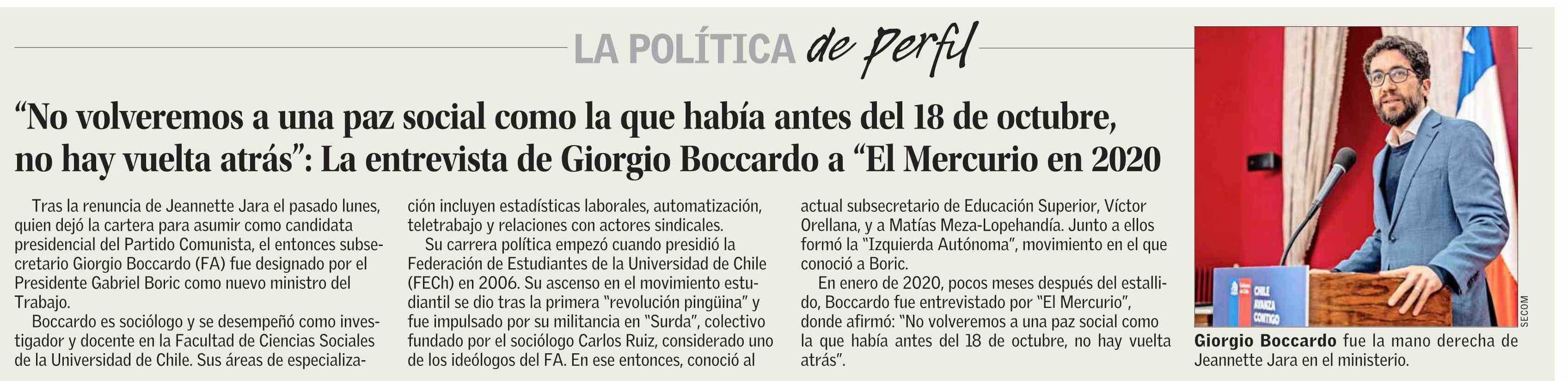 | Título: | “No volveremos a una paz social como la que había antes del 18 de octubre, no hay vuelta atrás”: La entrevista de Giorgio Boccardo a “El Mercurio en 2020 |