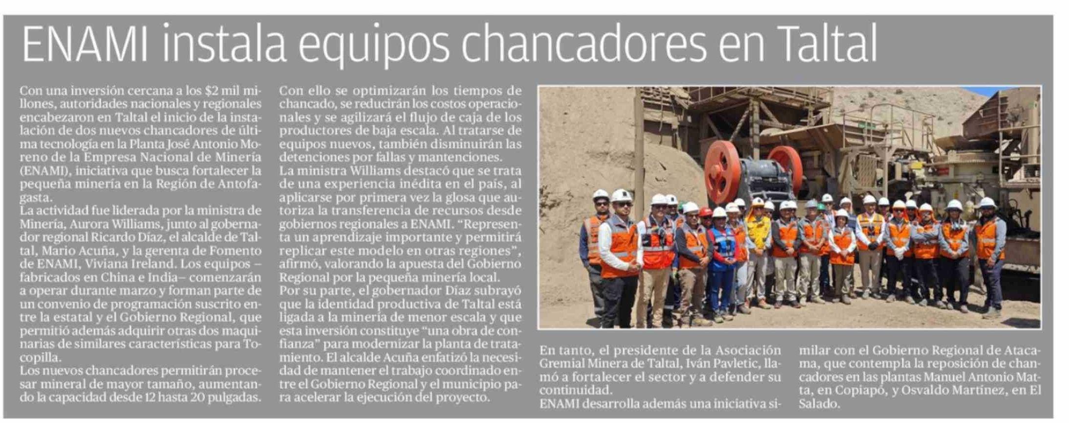 ENAMI instala equipos chancadores en Taltal 28-02-2026 Revista Norte Minero - Regiones I, II y III |