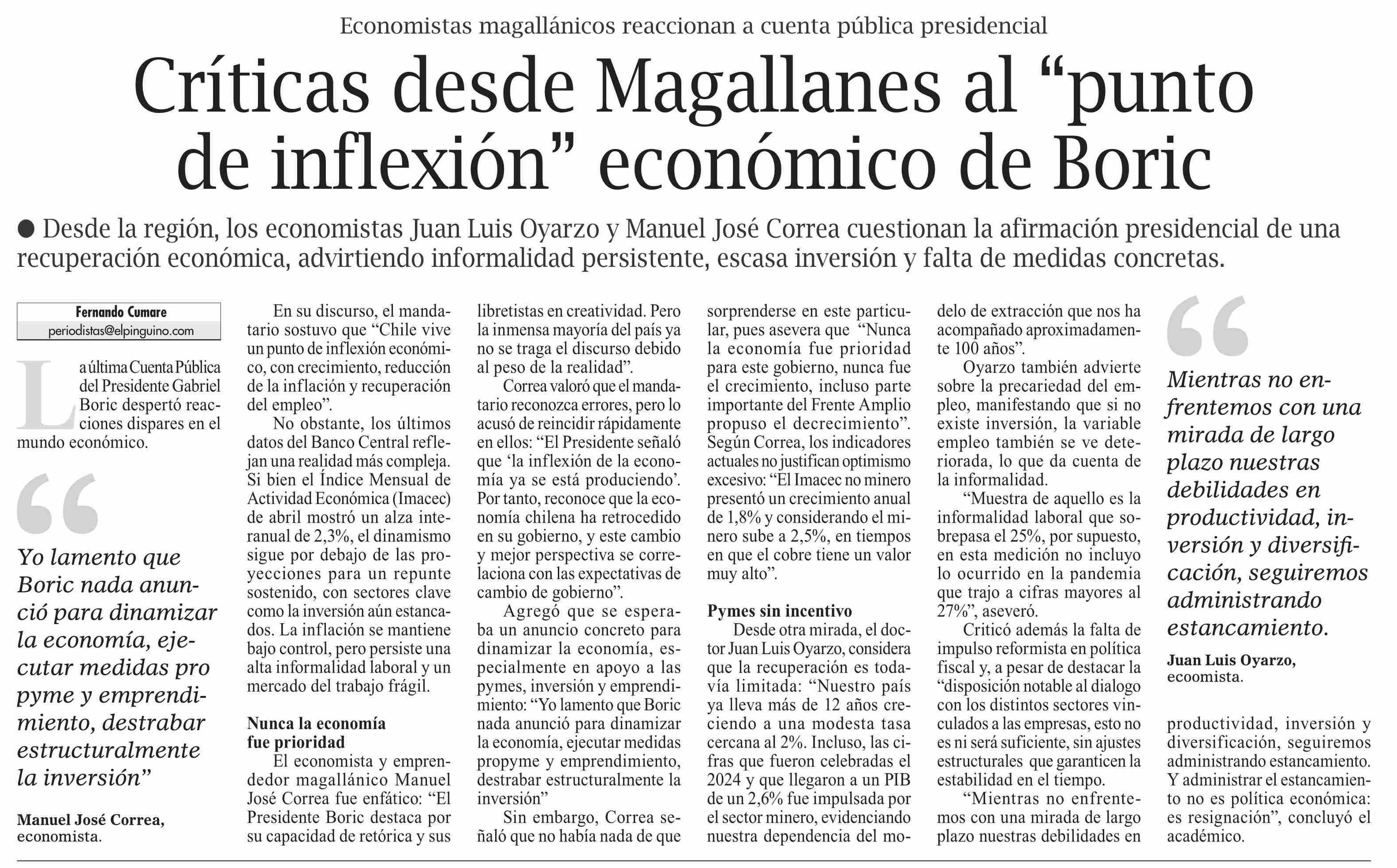 Críticas desde Magallanes al “punto de inflexión” económico de Boric 03-06-2025 El Pingüino |