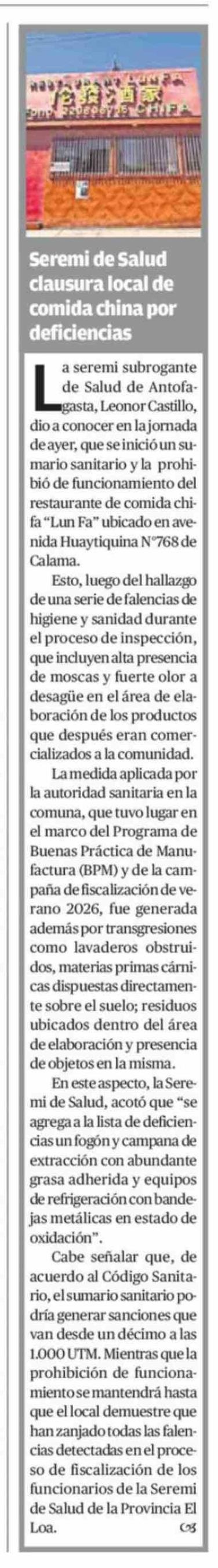 Seremi de Salud clausura local de comida china por deficiencias 14-02-2026 El Mercurio de Calama |